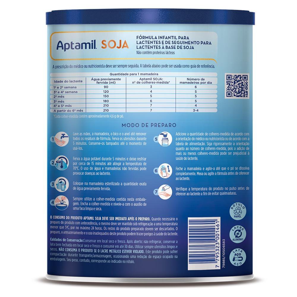 Fórmula Infantil: Aptamil Soja 800g - 0-12 meses Aptamil Soja é uma fórmula infantil para lactentes de 0 a 12 meses à base de soja. Não possui proteínas lácteas.Características:- Fórmula infantil para lactentes de 0 a 12 meses- À base de soja- Não contém proteínas lácteas- Consulte seu médico pediatra e/ou nutricionistaModo de Preparo:1. Lave as mãos, a mamadeira, o bico e o anel até remover todos os resíduos de fórmula. Ferva os utensílios durante 5 minutos e conserve-os tampados até o momento de usá-los.2. Ferva água potável durante 5 minutos e deixe resfriar por cerca de 15 minutos até atingir a temperatura de 70°C. O uso de água e mamadeiras não fervidas pode provocar doenças à criança.3. Coloque na mamadeira esterilizada a quantidade exata de água previamente fervida.4. Sempre utilize a colher-medida contida nesta embalagem. Encha a colher-medida e nivele-a com o auxílio de uma faca limpa e seca.5. Adicione a quantidade de colheres-medida de acordo com a orientação do médico ou nutricionista ou de acordo com a tabela de alimentação. Siga rigorosamente o número de colheres-medida, pois a adição de mais ou menos colheres-medida pode ser prejudicial à saúde da criança.6. Feche a mamadeira e agite-a até que o pó se dissolva completamente. Mexa ou agite a fórmula antes de oferecer à criança.7. Verifique a temperatura do produto no pulso antes de oferecer à criança a fim de evitar queimaduras.8. O CONSUMO DO PRODUTO APTAMIL SOJA DEVE SER IMEDIATO APÓS O PREPARO. Quando necessário o preparo do produto com antecedência, o mesmo deve ser mantido sob refrigeração a uma temperatura menor que 5ºC, por no máximo 24 horas.9. Os restos do produto preparado devem ser descartados.10. O preparo, o armazenamento e o uso inadequados deste produto podem trazer perigos à saúde do lactente. IngredientesMaltodextrina, óleos vegetais (óleo de palma, óleo de canola, óleo de coco, óleo de girassol alto oleico, óleo de girassol), proteína de soja*, fosfato de cálcio tribásico, citrato tripotássico, carbonato de cálcio, cloreto de potássio, fosfato de magnésio dibásico, cloreto de colina, ácido L-ascórbico, carbonato de magnésio, taurina, mio-inositol, sulfato ferroso, sulfato de zinco, L-carnitina, acetato de DL-alfa- tocoferila, nicotinamida, D-pantotenato de cálcio, riboflavina, palmitato de retinila, DL-alfa tocoferol, cloridrato de cloreto de tiamina, cloridrato de piridoxina, sulfato cúprico, iodeto de potássio, ácido N-pteroil-L-glutâmico, fitomenadiona, D-biotina, colecalciferol, selenito de sódio, cianocobalamina e emulsificante lecitina. NÃO CONTÉM GLÚTEN. ALÉRGICOS: CONTÉM DERIVADOS DE SOJA. PODE CONTER PEIXE. 1. O leite materno é o melhor alimento para os lactentes.ESTE PRODUTO SOMENTE DEVE SER USADO NA ALIMENTAÇÃO DE CRIANÇAS MENORES DE 1 (UM) ANO DE IDADE COM INDICAÇÃO EXPRESSA DE MÉDICO OU NUTRICIONISTA. O ALEITAMENTO MATERNO EVITA INFECÇÕES E ALERGIAS E FORTALECE O VÍNCULO MÃE-FILHOO PRODUTO MENCIONADO NÃO CONTÉM GLÚTEN. Consulte sempre seu médico e/ou nutricionista.