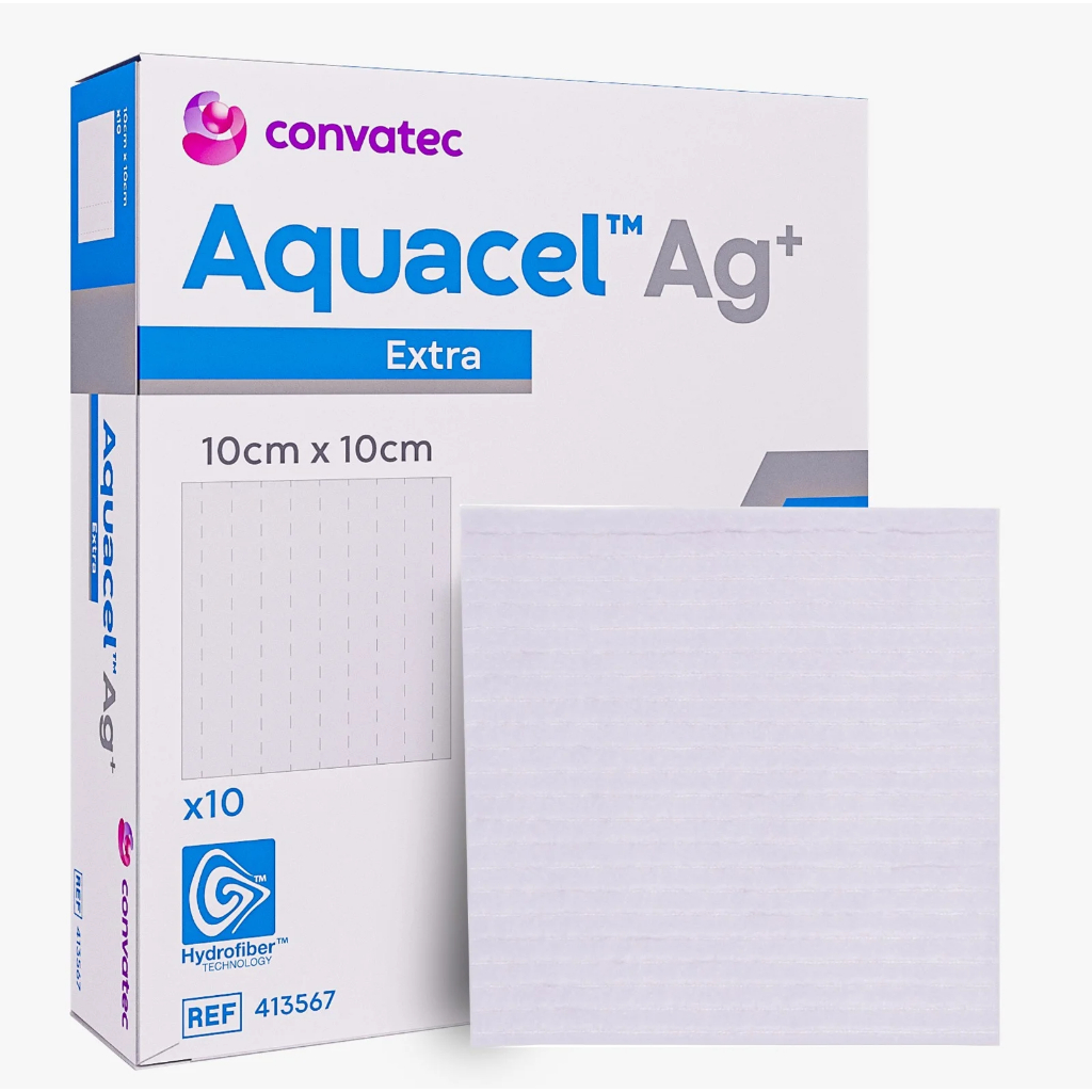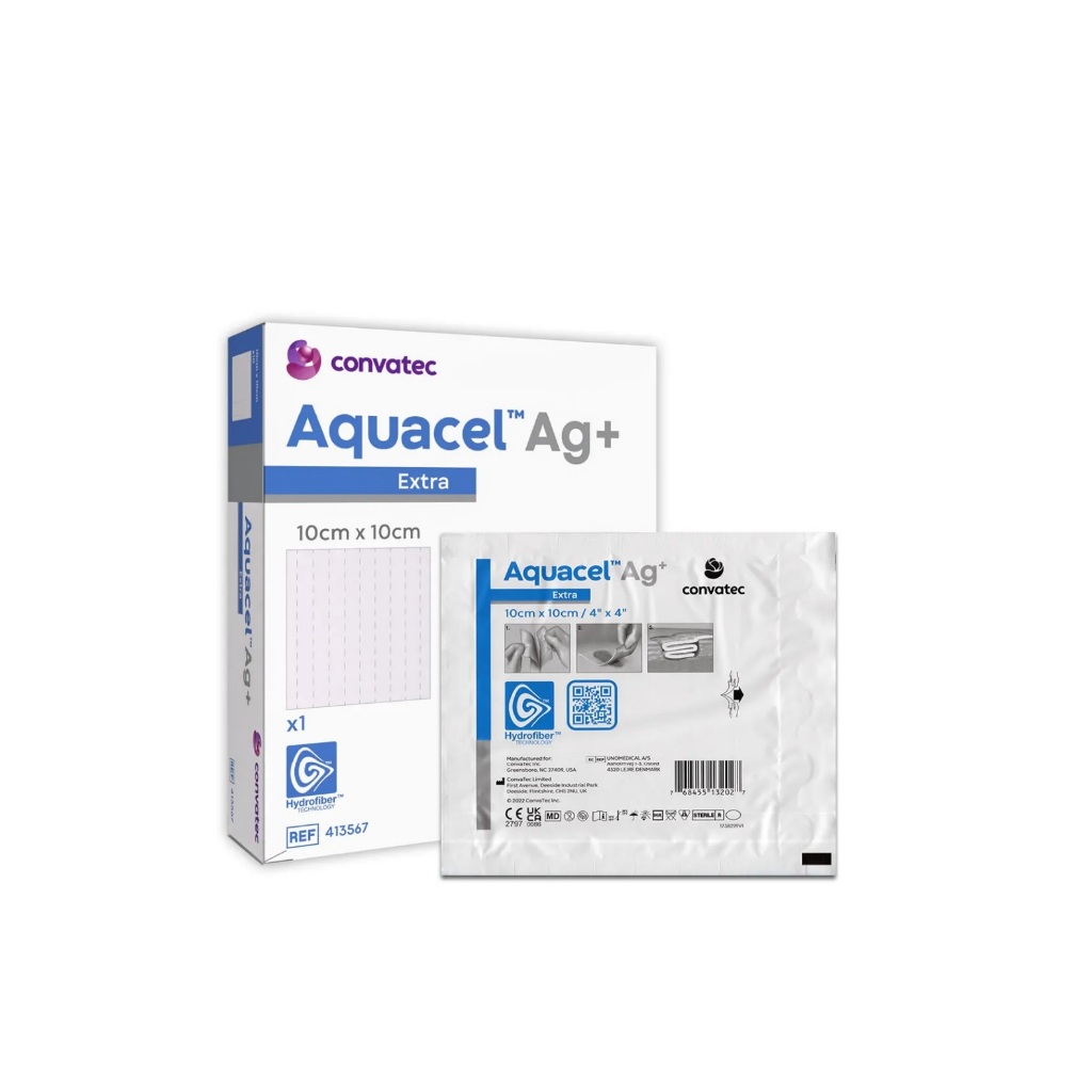 AQUACEL AG+ EXTRA 10cm X 10cm Curativo de dupla camada de Tecnologia Hydrofiber® com prata iônica e fibras de reforço. Com Tecnologia Ag+ para o combate ao biofilme Curativo primário, estéril, não aderente e macio, em forma de placa. Absorve grandes quantidades de exsudato e é composto por duas poderosas tecnologias. São duas camadas de hidrofibra 100% carboximetilcelulose (Tecnologia Hydrofiber®), costurado com fibras de celulose regenerada, altamente resistente. A Tecnologia Ag+ destrói o biofilme e impede a sua reformação e garante a disponibilidade de prata iônica. A prata iônica tem um amplo espectro e não é dispensada no leito da ferida. OBS: VALOR REFERENTE A 1 CAIXA COM 10 UNIDADE DE CURATIVO.