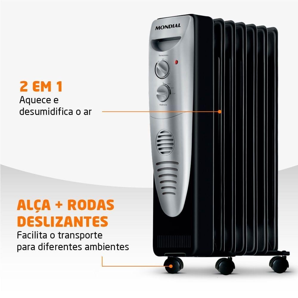 Aquecedor A óleo Mondial A-06 Aquecedor A Oleo-220v-preto/prataSilêncio, segurança e qualidade Mondial para os dias frios. O aquecedor a óleo A-06 possui três níveis de potência: 600, 900 e 1500W. Assim você regula o aquecimento de acordo com a necessidade do ambiente. É extremamente silencioso e aquece com mais conforto e muito menos barulho. O sistema de segurança desliga o aparelho em caso de queda ou instabilidade de energia e suas rodas deslizantes e alças facilitam o seu transporte. Na hora de guardar, utilize o guarda-fio para facilitar o armazenamento do cabo. A Mondial é a marca de eletrodomésticos mais vendida do Brasil e a escolha de milhões de consumidores. Sempre inovando e buscando soluções para o bem-estar das pessoas, oferece uma linha completa de produtos. Em constantes pesquisas junto aos consumidores, seu portfólio ganha destaque na qualidade, no design moderno e na excelente relação custo x benefício. Modelo - A-06 Cor - Preto/Cinza Voltagem (Tensão) - 127V/220V Itens inclusos - 01 Aquecedor - Manual de Instruções Potência - 1500W Consumo de energia - 1,5Kw/h Tipo de aquecimento - Aquecedor a Óleo Níveis de aquecimento - 3 níveis Dispositivos de segurança - Desligamento automático Resistências fechadas - - Luz indicadora - Lâmpada piloto Dimensões do produto - 65,5cm x 39cm x 15,9cm (AxLxP) Peso do produto - 8,080kg Comprimento do cabo - 1m Garantia - 1 ano