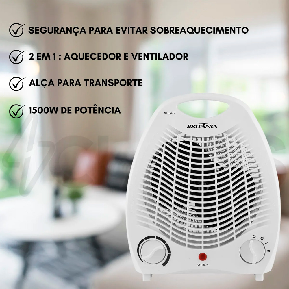 O que está adquirindo: • 1 Aquecedor Britânia AB1100N • Manual do produto Descrição do Produto: O Aquecedor Britânia AB1100N é compacto, eficiente e ideal para aquecer ambientes nos dias frios, podendo também ser utilizado como ventilador. Possui 3 níveis de potência, controle de temperatura ajustável e sistema de segurança contra superaquecimento. Leve e prático, conta com alça para transporte e cabo de 1,40m, oferecendo conforto térmico com praticidade durante todo o ano. Especificações Técnicas: • Modelo: AB1100N • Função: Aquecedor e ventilador • Potência: 1500W (127V) / 2000W (220V) • Voltagem: 127V ou 220V (escolher, quando disponível) • Consumo: 1,5 kW/h • Níveis de potência: 3 (2 aquecimento + 1 ventilação) • Controle de temperatura: Ajustável • Sistema de aquecimento: Resistência • Dispositivo de segurança: Contra superaquecimento • Luz indicadora de funcionamento: Sim (vermelha) • Comprimento do cabo: 1,40m • Material: Plástico e metal • Cor: Branco • Altura: 26 cm • Largura: 22 cm • Profundidade: 13,3 cm • Peso: 0,988 kg Aplicações Recomendadas: • Quartos • Salas de estar • Escritórios • Ambientes comerciais pequenos • Dormitórios Manuseio e Manutenção: • Utilizar em superfície plana e estável • Não cobrir o aparelho durante o funcionamento • Limpar apenas com pano seco • Evitar contato com água • Desligar da tomada após o uso SKU: 05102025 Garantia: 360 dias (12 meses)
