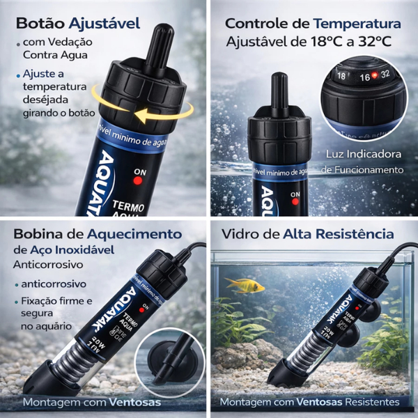 Termostato para Aquário Aquatank TERMO AQUA – 25W a 300W O Aquatank Termo Aqua é um aquecedor com termostato desenvolvido para manter a temperatura ideal da água do seu aquário, proporcionando mais conforto e segurança para seus peixes. Possui controle de temperatura ajustável, luz indicadora de funcionamento e estrutura resistente para uso contínuo. Fabricado com vidro de alta resistência e bobina de aquecimento em aço inoxidável anticorrosivo, garante aquecimento eficiente e durabilidade. A instalação é simples e segura, utilizando ventosas resistentes para fixação no aquário. Características: - Temperatura ajustável de 18°C a 32°C - Botão ajustável com vedação contra água - Luz indicadora de funcionamento - Vidro reforçado de alta resistência - Bobina de aquecimento em aço inox - Fixação com ventosas - Potências disponíveis: 25W • 50W • 100W • 200W • 300W Indicado para aquários de água doce ou salgada, podendo aquecer até aproximadamente 300 litros de água, dependendo da potência escolhida.