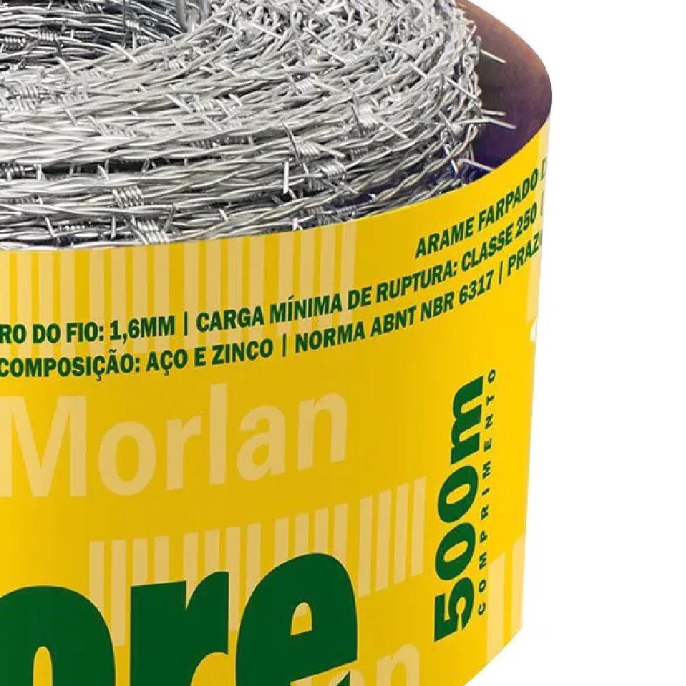 Arame Farpado 500 Metros Nelore 1,60mm 1078 MORLAN Detalhes do Produto: O arame farpado Nelore é utilizado principalmente na confecção de cercas em fazendas, sítios ou chácaras. Suas principais qualidades incluem ser maleável, flexível e de fácil manuseio. Detalhes Técnicos: Referência: 1078-500M; Conteúdo da embalagem: 1 rolo de arame farpado com 500 metros; Aplicações/dicas de uso: O arame farpado Nelore é utilizado na confecção de cercas em fazendas, sítios ou chácaras; Destaques/diferenciais (características): É maleável, flexível e de fácil manuseio; Massa aproximada (peso): 19,81 kg; Garantia: Garantia legal de 90 dias; Modelo: Nelore; Comprimento por rolo de arame: 500 metros; Massa aproximada por rolo de arame farpado: 19,60 kg; Carga de ruptura: 250 kgf; Espaçamento entre farpas do arame farpado: 5" (125 mm); Torção do arame farpado: Alternada; Diâmetro do arame farpado: 1,60 mm; Fabricação do arame farpado: 02 fios de aço; Camada de zinco do arame: Leve. Recomendações de segurança (avisos/alertas): A instalação do Arame Farpado Nelore deve ser feita por profissionais qualificados, sempre com o uso de equipamento de proteção adequado. Em caso de dúvidas sobre a instalação, utilize o manual online. Mantenha o arame longe do alcance de crianças. Marca: MORLAN Referência: 1078 Garantia: 3 Meses *Imagens meramente ilustrativas.