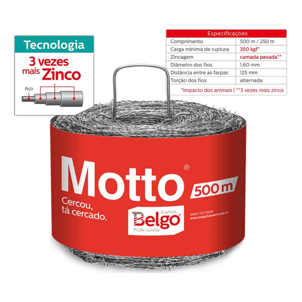 Arame Farpado Belgo Motto 500 Metros - O Mais Vendido do Mundo! Se você busca a máxima segurança e durabilidade para sua propriedade, o Arame Motto da Belgo é a escolha definitiva. Líder absoluto de vendas mundialmente, ele é sinônimo de resistência e confiança para cercamentos rurais e urbanos. Diferente dos arames comuns, o Motto possui uma camada de zinco 3x mais pesada, o que garante uma proteção muito superior contra a ferrugem e a corrosão, mesmo em regiões úmidas ou com maresia. ✨ Diferenciais que fazem do Motto o melhor: Durabilidade Extrema: Tecnologia de galvanização (camada pesada) que dura muito mais tempo. Cerca Sempre Impecável: Possui torção alternada, mantendo o arame esticado sem "embarregar". Resistência Superior: Carga de impacto de 350 kgf, ideal para conter animais com segurança. Economia Real: Menos manutenção e maior tempo de vida útil para o seu cercamento. 📋 Especificações Técnicas: Marca: Belgo Modelo: Motto Comprimento: 500 metros Diâmetro do Fio: 1,60 mm Carga de Ruptura: 350 kgf Distância entre Farpas: 125 mm Peso do Rolo: Aproximadamente 21 kg GTIN (EAN): 7899192200168 📦 Por que comprar na Disk Ferramentas? Agilidade no Envio: Seu pedido é processado e enviado rapidamente. Produto Original: Garantia de procedência Belgo com Nota Fiscal.