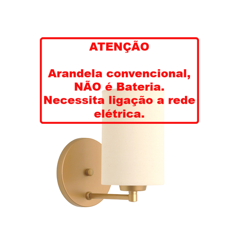 "ARANDELA EM ALUMÍNIO COM CÚPULA " - Produto em Alumínio. - Pintura Dourado Fosco. - Cúpula tecido Cru. - Soquete E.27 c/ fiação ( Lâmpada Led não inclusa ). - Medidas: 12cm Largura - 20cm Altura - 16cm Profundidade. - Medida Cúpula: 10 cm Diâmetro - 15cm Altura.