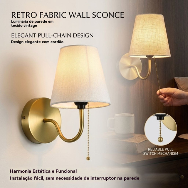 Arandela Parede Dourada Cúpula Tecido Interruptor Cordinha