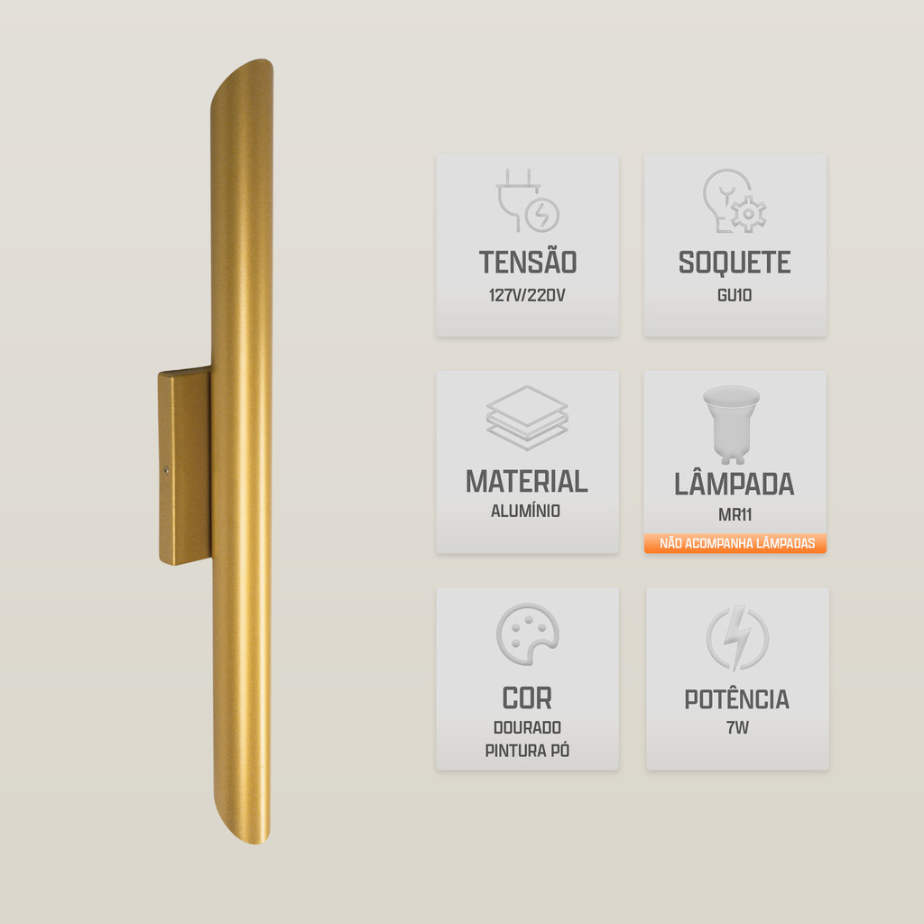 "Transforme seu ambiente com a Arandela AR 6080, um modelo sofisticado que combina design moderno e iluminação eficiente. Seu acabamento em alumínio proporciona um toque elegante e contemporâneo para qualquer espaço. Destaques do Produto -Com um Design Moderno e Sofisticado - Combinando com qualquer decoração e ambiente. -Modelo : AR 6080 -Cor(es) : Dourado / Preto / Champagne (Pintura Pó). -Material de alta qualidade : Feita com um Alumínio resistente para maior durabilidade. -Compatível com Lâmpadas GU10. -Ideal para diferentes ambientes - Perfeita para Quartos, Salas, Escritórios e Áreas Gourmet. -Peça com acionamento em interruptor instalado na residência. -Modelo NÃO recarregável. -Garantia de 3 Meses. Especificações Técnicas AR 6080 80X60X500MM 2X GU10 MR11 Material : Alumínio Cor : Dourado/Preto/Champagne Base (Canopla) : 80 mm X 12mm X 15mm Soquete da Luminária : GU10 Número de Lâmpadas : 2 Lâmpadas Voltagem : 127V - 220V Medida : 500mm de Altura 60mm de Largura 80mm de Comprimento Quantidade : 1 produto. OBSERVAÇÃO : A Lâmpada NÃO acompanha o produto. O produto necessita de instalação elétrica para o funcionamento adequado. Conteúdo da Embalagem : Kit 1: 1 Luminária. Kit 2: 2 Luminárias.