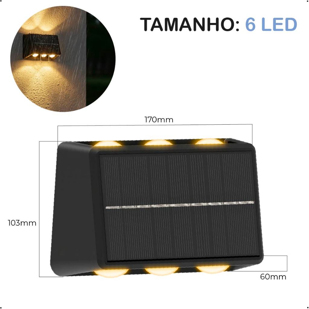 Arandela Solar LED 4 / 6 / 8 LEDs | Luz Quente | Placa Solar Embutida | À Prova D’Água Iluminação externa prática, zero fios e feita para aguentar sol, chuva e a rotina. Carrega de dia, acende sozinha à noite. ⚙️ Especificações 🔆 Iluminação Luz Quente Disponível em: 4 LEDs, 6 LEDs, 8 LEDs ☀️ Alimentação Solar Placa Solar embutida Zero consumo de energia elétrica Acionamento automático ao anoitecer 📏 Dimensões 4 LEDs: 107 × 98 × 64 mm 6 LEDs: 103 × 170 × 60 mm 8 LEDs: 111 × 231 × 61 mm 💧 Resistência À prova d’água Construção reforçada para uso externo 🏡 Ideal para: Muros, corredores externos, jardins, escadas, áreas de entrada e quintais.