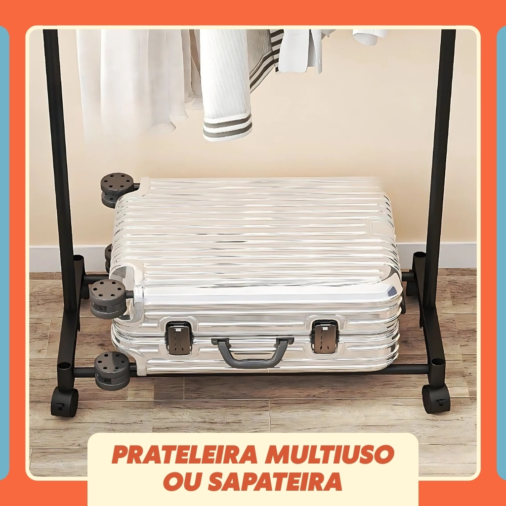 Arara Dupla de Roupa em Aço Inox Cabideiro Sapateira Quarto Resistente c/ Rodinha Multiuso + de 30 Cabides LINHA PREMIUM