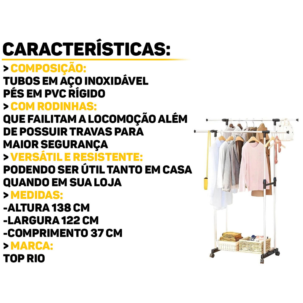 Arara Para Roupas Com 2 Regulagens Top Rio A Arara para Roupas com 2 Regulagens Top Rio é a solução ideal para organizar e otimizar o espaço do seu ambiente. Com design moderno e funcional, ela oferece duas opções de regulagem de altura. Perfeita para roupas de todos os tamanhos, garantindo que suas peças fiquem bem cuidadas e sem amassar. A estrutura robusta e resistente proporciona estabilidade, enquanto as rodinhas facilitam o deslocamento, oferecendo praticidade no dia a dia. Ideal para quem busca versatilidade e praticidade na hora de organizar o closet ou o espaço de lavanderia. Características: > Rodízios com trava; > Ajusta a altura e a largura facilmente; > Design moderno, garantindo durabilidade e resistência; > Ideal para ambientes pequenos ou que precisam de otimização de espaço; > Duas barras para pendurar roupas, proporcionando mais espaço e praticidade; > Possui base com prateleira para armazenar calçados de forma prática e acessível. Especificações Técnicas: > Material: plástico e metal; > Dimensões do produto (C x L x A): 1,22m x 37cm x 1,38m. - Marca: Top Rio - Garantia: 90 dias contra defeitos de fabricação Vantagens de comprar na Brester: - Produto a pronta entrega. - Produto novo, com garantia de fábrica. - Nota fiscal para Pessoa Física e Pessoa Jurídica.