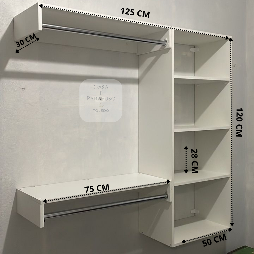 ATENÇÃO - MÁXIMO DE 1 ARARA CABIDEIRO POR COMPRA!! SE PRECISAR DE MAIS PEÇAS FAÇA UMA NOVA COMPRA SEPARADA!! Dúvidas só perguntar =) Descrição Um Closet suspenso moderno, compacto e versátil que pode ser usado para pendurar suas roupas ou outros itens com segurança em casa ou loja. Benefícios: - A Parte do Cabideiro pode ser Instalado em ambos os lados e na altura que preferir; - Fácil montagem e instalação, acompanha buchas e parafusos para a fixação; - Pode ser montado na Horizontal e na Vertical; - Praticidade. Além da vantagem na organização, o closet aberto também permite a visualização de todos os seus pertences de forma rápida; - Ambiente arejado; - Organização. O conceito de closet aberto está diretamente ligado a organização. Especificações Técnica: 2 Cabideiro Altura: 11,5 cm Comprimento: 75 cm Profundidade: 30 cm Espessura 15MM Peso Suportado: 15KG (CADA CABIDEIRO) Especificações Técnica: Estante Altura: 1,20m Comprimento: 50 cm Profundidade: 30 cm OBSERVAÇÃO- *PERMITIDO APENAS 1 PRODUTO POR COMPRA* ( PESO ULTRAPASSA O PERMITIDO)