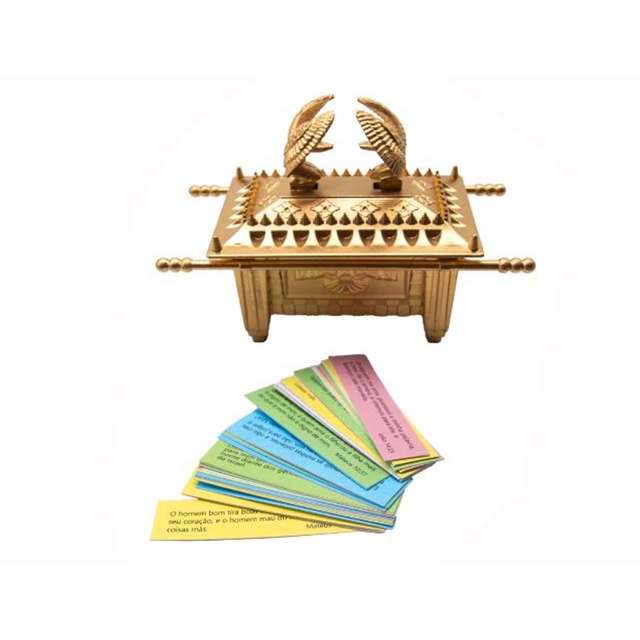 Arca Da Aliança - Caixinha de Promessas Caixa de promessas em formato de Arca da Aliança com diversos versículos da Bíblia Arca com um belo acabamento dourado brilhante. Um lindo presente e ações de evangelização Acompanha cerca de 160 versículos bíblicos nas cores: azul, branco, amarelo, rosa e verde com palavras de Jesus, citadas no Novo Testamento Versão: Almeida Corrigida Fiel ACF Material da Arca: Plástico ABS Dourado Medidas Externas aproximadas da Arca: 13cm x 9cm X 7cm Medidas Internas aproximadas da Arca: 7,4cm de comprimento x 4,2cm de largura x 3,2cm de profundidade Material das promessas: papel offset 120g Medidas promessas: 6,5cm X 1,7cm Peso: 75g