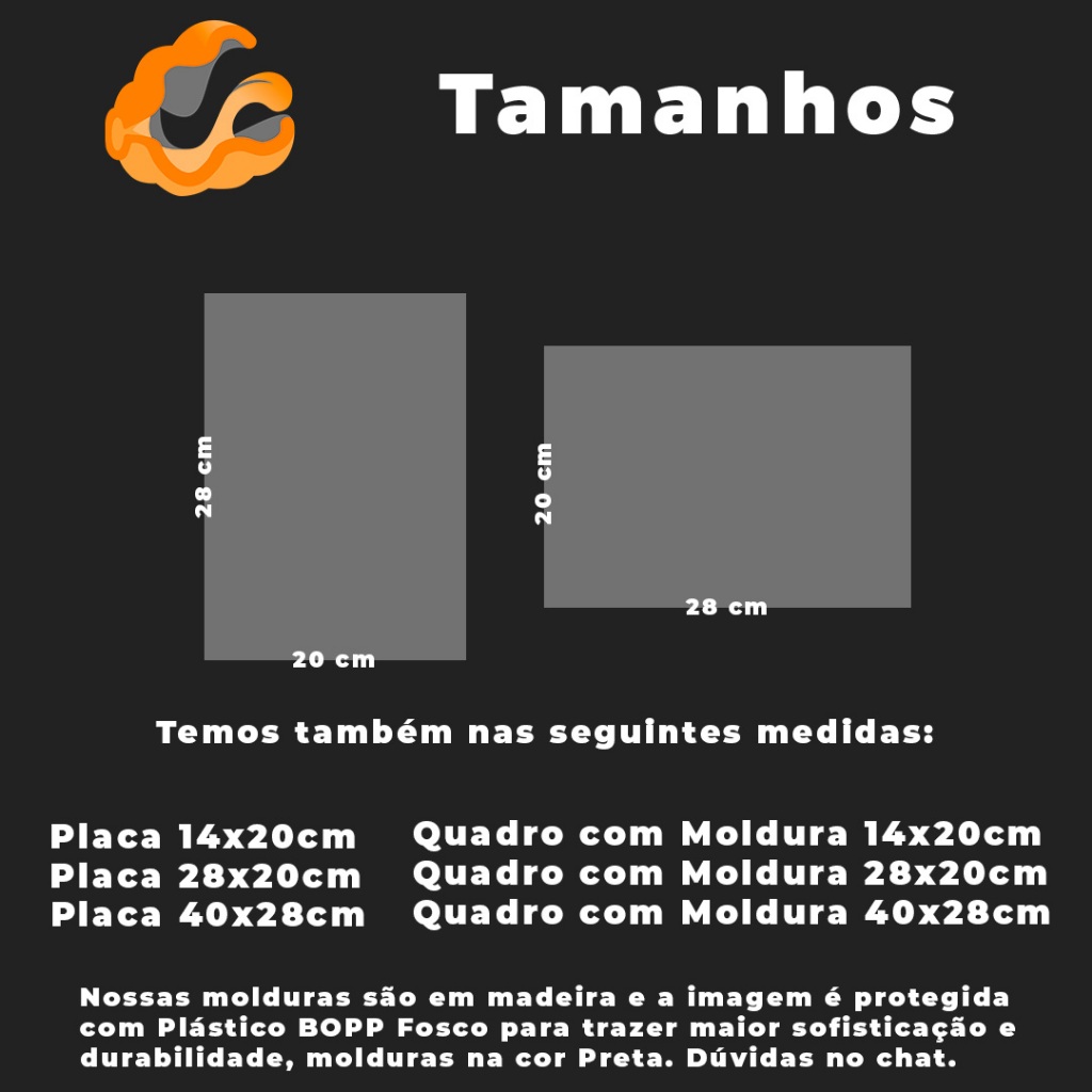 Bem-vindo a Ostra Store, Vi que se interessou em uma de nossas pérolas e quer saber mais, Bom, essas são as principais características: Nossos quadros tem 3 opções de tamanho: 14cm x 20cm (isso é aproximadamente metade de uma folha sulfite A4) e 28cm x 20cm (aproximadamente 1 folha sulfite A4), 40cm x 28cm (aproximadamente 2 folhas sulfite A4) 14cm x 20cm C/ Moldura - Preto - **Não acompanha vidro** - AxLxP - 24x18x1 cm 28cm x 20cm C/ Moldura - Preto - **Não acompanha vidro** AxLxP - 23x33x1 cm 40cm x 28cm C/ Moldura - Preto - **Não acompanha vidro** - AxLxP - 43x33x1 cm São feitos com MDF de 3mm de ótima qualidade, Impressos em papel fotográfico para garantir maior nitidez no seu produto, Todos os as artes são laminadas com BOPP fosco para trazer maior durabilidade e sofisticação, O valor do anúncio se refere a 1 quadro. Você quer saber o diferencial Ostra Store? Não vendemos só quadros, todas as artes escolhidas foram feitas especialmente para você, nós sabemos o quanto um simples objeto pode transformar sua casa em um lar. Usamos apenas materiais da melhor qualidade para evitar qualquer transtorno para você, sem contar que os quadros já vão prontos para colar na parede com fitas de fixação! Tem alguma dúvida ainda? pode me chamar pelo Chat que vou te ajudar! Atenciosamente, Victor ****Siga a loja para não perder nada****