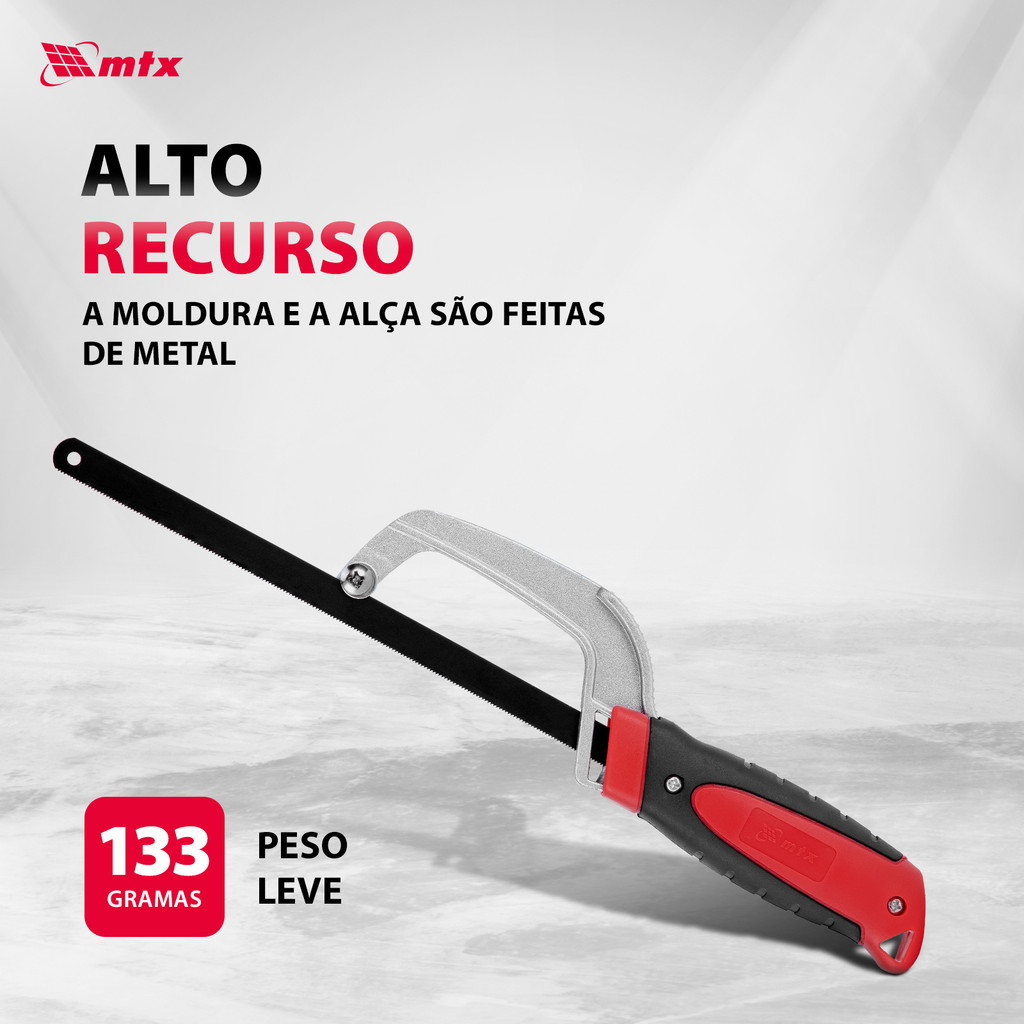 Serra para Metal MTX 7756059 – Leve, Resistente e Ideal para Cortes em Locais de Difícil Acesso A serra MTX 7756059 com lâmina de 250 mm é a escolha perfeita para cortes precisos em metal e plástico, sendo ideal para trabalhos de construção, reparos e manutenções de pequeno porte. Seu design compacto e funcional facilita o uso em locais de difícil acesso, garantindo praticidade em situações desafiadoras. Construída com quadro e alça de metal, a ferramenta oferece resistência e durabilidade, suportando uso intensivo em ambientes semiprofissionais. Com peso leve de apenas 133 g, a serra permite longos períodos de trabalho sem causar fadiga, contribuindo para maior produtividade. Para maior ergonomia, a serra conta com alça superior, que melhora o controle durante o corte em posições mais difíceis. Já a alça traseira emborrachada, com superfície em relevo, proporciona um agarre confiável e seguro, evitando deslizamentos mesmo com as mãos suadas ou em ambientes com poeira. Compacta, leve e resistente, a serra MTX 7756059 combina eficiência, conforto e durabilidade, sendo indispensável na maleta de ferramentas de qualquer profissional ou entusiasta do faça você mesmo.