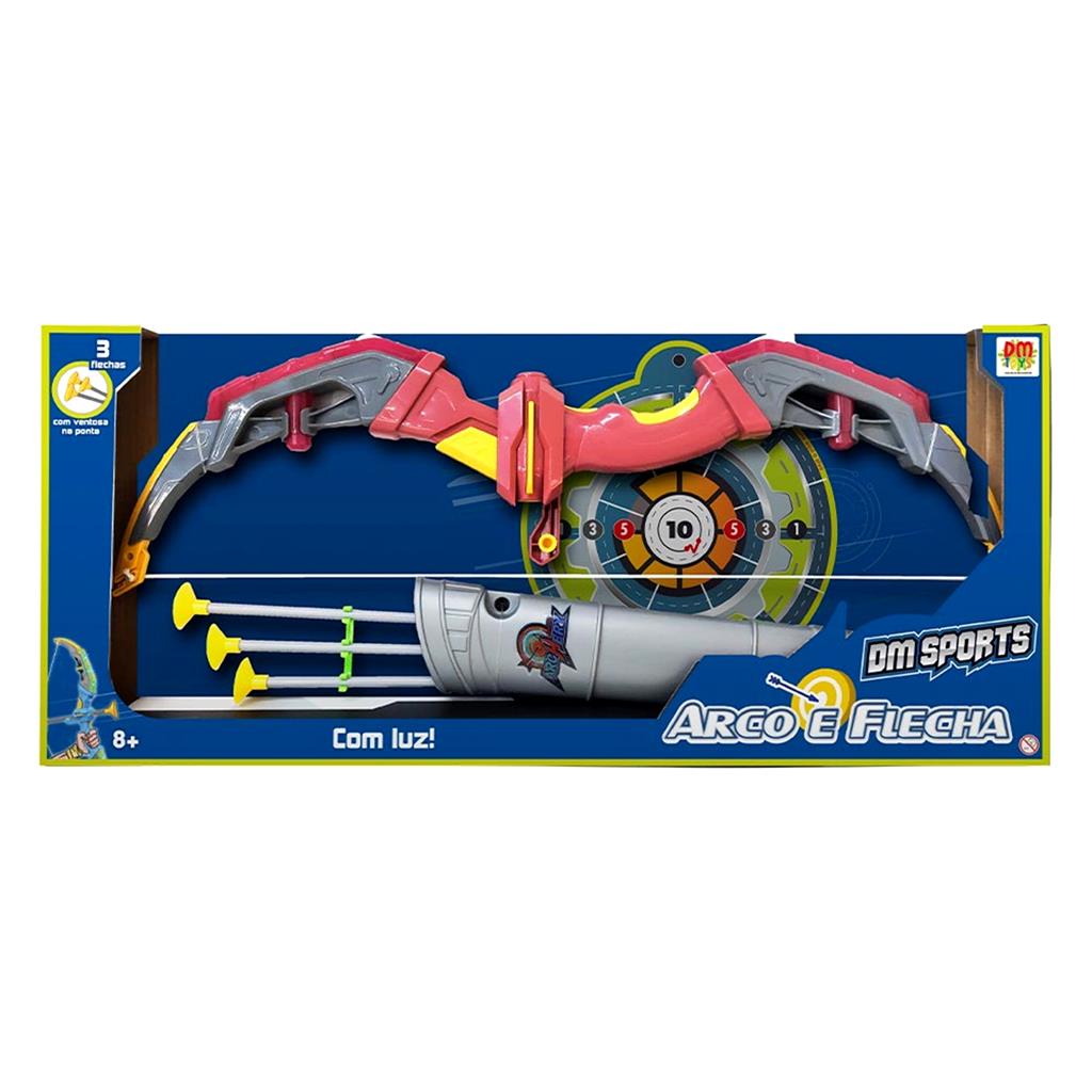 ARCO E FLECHA COM LUZ DM SPORTS - DM TOYS Explore seu espirito aventureiro com o Arco e Flecha com Luz DM Sports! Este brinquedo envolvente proporciona uma experiencia emocionante e cheia de diversao para criancas de todas as idades. Composto por um arco e tres flechas com ventosas na ponta, as criancas podem mergulhar em um mundo de imaginacao enquanto aprimoram suas habilidades de mira. Alem das flechas e do arco, o conjunto inclui um bonus especial: um alvo impresso no interior da embalagem! Basta recorta-lo e usa-lo como alvo para a brincadeira. Desafie-se a acertar o centro do alvo e aperfeicoe suas habilidades de mira enquanto se diverte. O destaque do Arco e Flecha com Luz DM Sports e sua incrivel funcionalidade luminosa. O arco e equipado com luzes que adicionam um toque extra de emocao as aventuras arqueiras. As luzes brilhantes ao longo do corpo do arco proporcionam uma experiencia visualmente cativante. Desenvolva a habilidade de mira, a coordenacao motora e proporcione momentos inesqueciveis de diversao com o Arco e Flecha com Luz DM Sports. Presenteie seus filhos com essa emocionante aventura e permita que eles explorem o mundo arqueiro enquanto se divertem de maneira segura e estimulante. Especificações: - Recomendado a partir de 8 anos - Contem: 01 Arco, 01 Suporte Para Flechas, 03 Flechas com Ventosa - Dimensoes da embalagem: (CLA) 28 x 5 x 65,5 cm - Comprimento aproximado do produto: - Arco: 63 cm - Flecha: 42 cm - Compartimento de flechas: 31,5 cm - Alvo de papel: 20 cm de diametro - Com luz - Composicao: Plastico ABS, PP, PVC, PE - Utiliza 2 pilhas "AA" (nao incluidas) - Marca: DM Sports - Referencia: DMT6418 - Certificado de Seguranca: INMETRO ATENCAO: As cores e detalhes podem variar de acordo com o lote de fabricacao em relacao as imagens apresentadas.