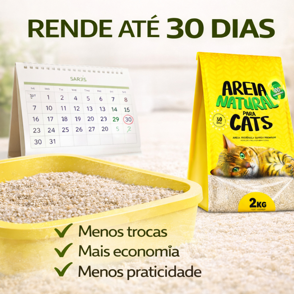 Areia Higiênica Natural Biodegradável Milho e Mandioca Para Gatos Tiger Cats 4kg A Areia Higiênica Tiger Cats 4kg é produzida com milho e mandioca, matérias-primas 100% naturais e biodegradáveis, garantindo máxima segurança para os gatos e respeito ao meio ambiente. Possui altíssima absorção, formando torrões firmes em segundos, sem grudar nas patinhas e sem levantar poeira. É uma areia higiênica moderna e eficiente, que elimina odores, dura mais tempo e deixa o ambiente sempre limpo. Ideal para gatos filhotes, adultos e idosos. Benefícios do Produto Produto 100% natural e biodegradável Feita com milho e mandioca Forma torrões firmes em até 20 segundos Não vira lama mesmo após absorver líquidos Não gruda nas patas, evitando sujeira pela casa Zero poeira: mais conforto para o gato e o tutor Controle avançado de odores Não tóxica: segura em caso de ingestão acidental Excelente rendimento, durando até 30 dias por gato Embalagem resistente com 4kg de capacidade Por que a Tiger Cats é a escolha ideal? Fórmula aprovada por veterinários, pois a cor clara da areia ajuda na detecção precoce de problemas urinários, facilitando notar alterações na cor da urina (como sinais de sangue). Um produto desenvolvido com foco em qualidade, segurança, sustentabilidade e praticidade, sem químicos agressivos e sem impacto ambiental negativo. Como usar Coloque na bandeja cerca de 3 cm de camada Remova os torrões firmes diariamente Reponha a areia conforme houver necessidade Limpeza rápida e sem desperdício
