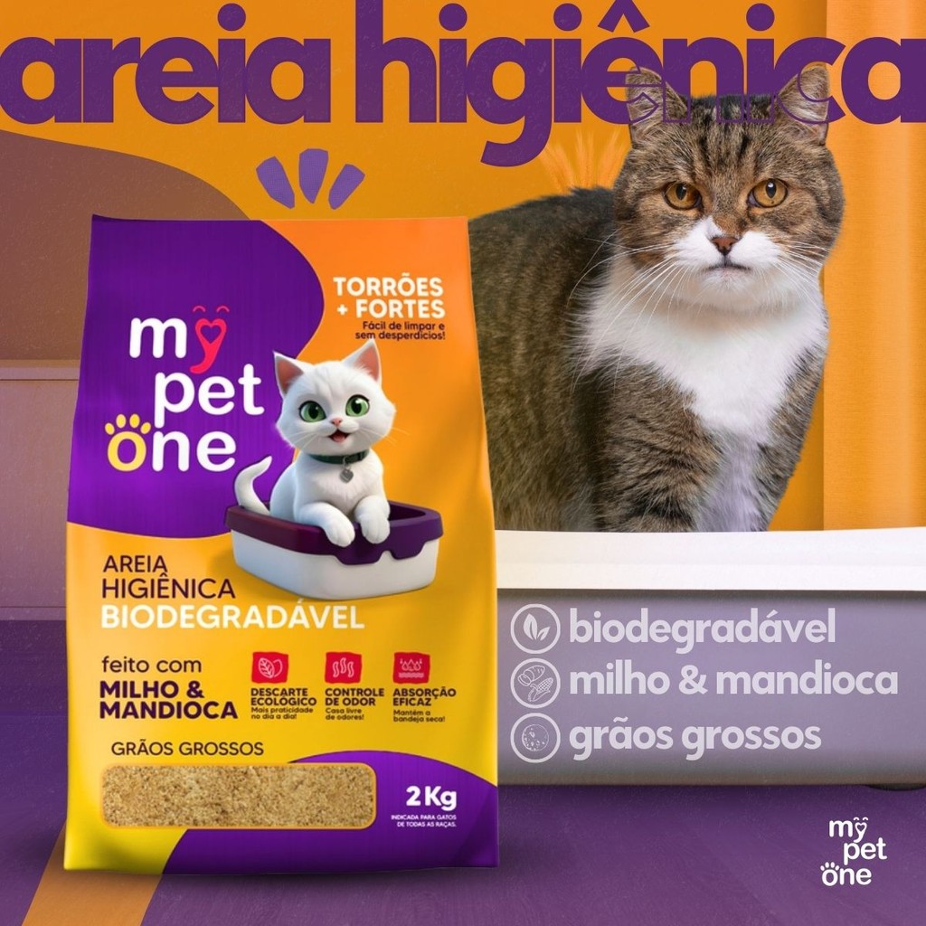 Areia Biodegradável Bio Gold Grossa MyPetOne – 2Kg A Areia Biodegradável Bio Gold Grossa MyPetOne foi criada para unir praticidade, desempenho superior e responsabilidade ambiental. Produzida à base de milho e mandioca, matérias-primas naturais e renováveis, ela garante um controle eficiente de odores, aglomeração rápida e firme, além de ser 100% biodegradável. Com grãos grossos e textura diferenciada, oferece maior durabilidade, menos poeira e uma experiência mais confortável para o seu gato. Sua fórmula natural facilita o descarte ecológico, podendo ser destinada ao lixo orgânico, composteira ou até mesmo ao vaso sanitário em pequenas quantidades. Benefícios - 100% biodegradável e sustentável - Grãos grossos que reduzem a formação de poeira - Aglomeração firme que facilita a remoção diária - Controle eficiente de odores indesejados - Maior durabilidade e praticidade no dia a dia Modo de Uso - Preencha a caixa de areia com uma camada de pelo menos 5 cm da Areia Bio Gold MyPetOne - Remova e descarte diariamente os torrões formados e as fezes - Complete a caixa conforme a necessidade para manter a altura indicada Informações Técnicas - Composição: Milho e mandioca - Peso líquido: 2 Kg - Indicação: Gatos de todas as raças - Origem: Indústria Brasileira A escolha perfeita para quem busca higiene, praticidade e cuidado com o meio ambiente sem abrir mão do conforto do seu gato.