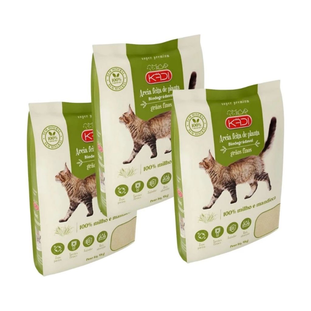 Areia Biodegradável Kadi Grãos Finos Gato 12 KG Grão Cat Milho Mandioca Bio (3 pacotes de 4 kg)