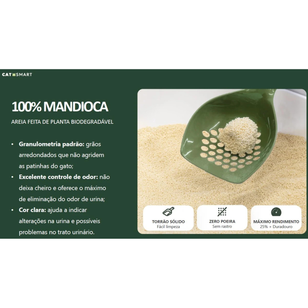 Areia Higiênica Cat Smart Fina Biodegradável Para Gatos 100% Mandioca 4 kg A Areia Higiênica Cat Smart Fina é um granulado sanitário ecológico, desenvolvido com fibras vegetais naturais e livre de aditivos químicos, ideal para tutores que buscam praticidade, controle de odores e um produto sustentável para a higiene do gato. Com granulometria fina, oferece alta absorção, formação de torrões firmes e maior conforto para as patas sensíveis dos felinos. Além de ser 100% biodegradável, pode ser descartado diretamente no vaso sanitário (em pequenas quantidades), facilitando a limpeza e tornando o cuidado com o pet ainda mais prático. Diferenciais: Granulado vegetal fino: mais conforto para as patas e melhor rendimento. 100% biodegradável e ecológico. Alta absorção com torrões firmes e fáceis de remover. Controle eficiente de odores. Pode ser descartado no vaso sanitário (em pequenas quantidades). Livre de químicos agressivos e seguro para o pet. Mais sobre o Produto: A linha Cat Smart Bio alia sustentabilidade à eficiência, sendo ideal para ambientes internos. A versão fina proporciona excelente rendimento e é indicada para gatos exigentes ou mais sensíveis. Dicas de Uso: Espalhe uma camada de aproximadamente 5cm na bandeja higiênica. Remova diariamente os torrões e complete com mais granulado quando necessário. Pode ser descartado no vaso sanitário ou lixo orgânico. Ficha Técnica: Marca: Cat Smart Linha: Bio Tipo: Granulado sanitário vegetal Peso: 4kg Indicação: Gatos de todas as idades Composição: Fibras vegetais naturais Granulometria: Fina Benefícios: Biodegradável, econômico, confortável, controle de odores, descarte facilitado