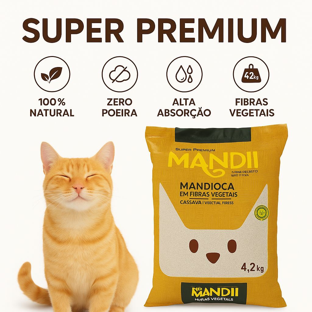 ESSE PRODUTO NA VENDA PELA SHOPEE DIRETA SE RESTRINGE A DOIS PACOTES POR ENVIO O frete na modalidade de entrega direta está limitado ao envio de, no máximo, duas unidades por pedido Ofereça o melhor conforto e higiene para o seu gato com a Areia MANDII Super Premium, desenvolvida com fibras vegetais naturais de mandioca, uma alternativa ecológica, segura e altamente absorvente. Produzida com tecnologia sustentável, é 100% biodegradável, não agride o meio ambiente e proporciona um ambiente limpo, seco e sem odores para o seu pet. ⸻ Benefícios da Areia MANDII 100% Natural e Vegetal – feita a partir de fibras de mandioca, sem químicos agressivos. Zero Poeira – não levanta pó, ideal para gatos sensíveis e para manter a casa sempre limpa. Alta Absorção – forma torrões firmes e fáceis de remover, mantendo a bandeja sempre seca. Controla os Odores – neutraliza o cheiro de urina e fezes naturalmente. Pode ser Descartada no Vaso Sanitário – prática e ecológica, dissolve facilmente em contato com a água. Rendimento Excelente – 6 litros rendem muito mais, com absorção eficiente. Recomendada por Veterinários – segura, hipoalergênica e confortável para as patinhas do seu gato. ⸻ Modo de Uso Aplique uma camada de 4 a 5 cm de areia na caixa higiênica. Remova os torrões e fezes diariamente. Descarte os torrões no vaso sanitário ou lixo comum. Complete com nova areia para manter o nível. Dica: Nos primeiros dias, misture a areia antiga com a MANDII para uma adaptação gradual. ⸻ Especificações • Composição: Fibras vegetais de mandioca • Peso líquido: 4,2 kg (rende 6 L) • Tipo: Granulado higiênico vegetal • Indicação: Gatos de todas as idades • Origem: Produto 100% nacional ⸻ Por que escolher a MANDII? Porque é natural, prática, ecológica e super eficiente! Deixe o ambiente do seu gato sempre limpo, seco e sem odores, enquanto cuida da natureza 🌎
