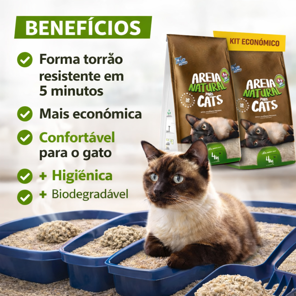Descrição do Produto** Areia Higiênica Natural Biodegradável Mandioca Para Gatos Tiger Cats 8kg ( 2 pacotes de 4kgs cada um ) Composição: Pacote contém 8 KG - 100% natural e biodegradável - 100% mandioca Descrição do Produto - Forma torrões firmes em até 5 MINUTOS - Não forma lama - Não gruda nas patinhas - Sem poeira - Evita o desperdício, maior rendimento - Elimina odores - Produto Atóxico, não causa danos ao pet - Dura aproximadamente 30 dias Sobre o produto: Areia 100% biodegradável, feita apenas com produtos naturais (MANDIOCA). A ausência de pó e químicos também contribui para melhorar a qualidade de vida de nossos amigos de quatro patas. Fórmula aprovada por veterinários, pois auxilia no diagnóstico clínico de problemas urinários; a cor clara da areia à base de mandioca facilita a percepção de alterações na cor da urina. Dicas de uso: - Colocar na bandeja uma quantidade suficiente para formar uma camada de 5 cm - Os torrões podem ser removidos após 5 minutos - Importante que a caixa seja limpa todos os dias Descarte: Recomendamos que o descarte seja realizado em lixo orgânico.