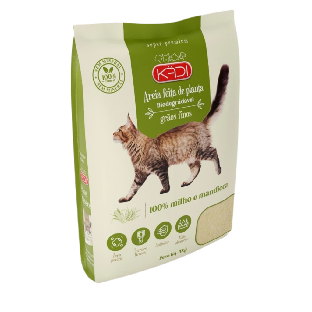 Areia Higiênica para Gatos Grãos Finos Kadi 4kg Composição 100% natural: Feita de milho e mandioca, biodegradável e livre de resíduos químicos. Alta capacidade de absorção: Forma torrões firmes que facilitam a limpeza e evitam desperdício. Redução eficiente de odores: Neutraliza os cheiros de urina e fezes, garantindo um ambiente mais agradável. Sem poeira: Ajuda a prevenir problemas respiratórios em gatos sensíveis. Cor clara: Permite identificar alterações na urina ou fezes, favorecendo um cuidado preventivo com a saúde do animal. Custo-benefício elevado: Alta durabilidade e rendimento, minimizando o consumo excessivo. Sustentável e fácil de descartar: Pode ser eliminada no lixo orgânico comum, sem impacto ambiental. Adaptação gradual: Processo simples de transição para que o gato se acostume à nova textura e composição. A Areia Higiênica para Gatos Grãos Finos KADI é uma alternativa inovadora e responsável para quem busca o melhor para o seu gato e para o meio ambiente. Feita a partir de milho e mandioca, esta areia biodegradável oferece uma experiência superior tanto em absorção quanto em cuidado com a saúde felina. Além disso, sua composição 100% natural e livre de resíduos químicos reflete um compromisso com a sustentabilidade, garantindo que cada grão contribua para um mundo mais limpo. Com a crescente conscientização ambiental, produtos biodegradáveis têm ganhado destaque no mercado, e a Areia Higiênica KADI não é diferente. Sua composição natural a torna amigável ao meio ambiente, degradando-se rapidamente sem deixar resíduos nocivos. Isso significa que você está não apenas cuidando do conforto do seu gato, mas também contribuindo diretamente para a preservação do planeta. Além de ser sustentável, a areia é livre de poeira, uma característica essencial para evitar problemas respiratórios nos gatos, especialmente aqueles mais sensíveis. Seu processo de fabricação avançado elimina partículas finas, resultando em uma experiência mais segura tanto para os animais quanto para seus tutores. Absorção Máxima e Redução de Odor Um dos grandes diferenciais da Areia Higiênica KADI é sua capacidade de absorção excepcional. Essa característica permite a formação de torrões firmes e instantâneos, o que facilita a limpeza da caixa de areia. Ao evitar que os grãos com urina se misturem com a areia limpa, a KADI não apenas economiza material como também mantém a área de higiene do seu gato mais agradável. Outro aspecto que merece destaque é a eficiência na redução de odores. Os grãos finos da KADI capturam e neutralizam os cheiros de urina e fezes de maneira eficaz, tornando o ambiente mais confortável para todos. Essa propriedade é especialmente útil em residências pequenas ou com múltiplos gatos, onde o controle do odor é crucial para o bem-estar geral. Praticidade na Limpeza A limpeza da caixa de areia é um ponto sensível para muitos tutores de gatos, e a Areia Higiênica KADI torna essa tarefa mais prática e menos desgastante. A formação de torrões firmes facilita a remoção dos resíduos sem deixar rastros. Isso significa menos desperdício e maior durabilidade do produto. Além disso, a areia não deixa resíduos acumulados no fundo da caixa, eliminando a necessidade de limpezas constantes e mais profundas. Essa característica, aliada à alta absorção, faz com que a KADI tenha um excelente custo-benefício. Benefícios para a Saúde do Seu Gato A saúde dos felinos é uma prioridade absoluta para qualquer tutor responsável, e a Areia Higiênica KADI foi desenvolvida com esse foco em mente. Além de ser livre de poeira, sua cor clara desempenha um papel fundamental na identificação de possíveis alterações na urina ou fezes do gato. Alterações na tonalidade ou consistência podem ser sinais precoces de problemas de saúde, e a areia KADI permite uma observação mais cuidadosa. Por ser feita com ingredientes naturais como milho e mandioca, ela também é segura para gatos que possuem pele sensível ou alergias. A ausência de resíduos químicos minimiza o risco de irritações, tornando-a ideal para gatos de todas as idades e raças. Como Usar a Areia Higiênica KADI Para obter o melhor desempenho, é importante seguir as orientações de uso da areia KADI. O ideal é preencher a caixa de areia do seu gato com, no mínimo, 5 cm de produto. Isso garante que os torrões se formem corretamente e facilita a remoção diária dos resíduos. A limpeza deve ser feita diariamente, retirando os torrões e repondo a areia para manter a quantidade ideal. O descarte pode ser feito no lixo orgânico comum, o que reforça o compromisso com a sustentabilidade.
