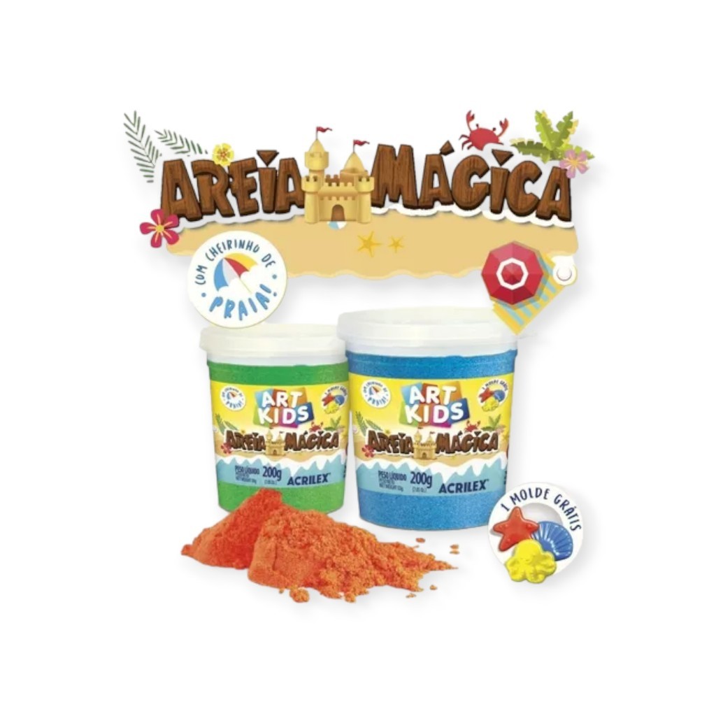 Areia Mágica Infantil 200g - Acrilex O anúncio contém: 1 Pacote de Areia Mágica Acrilex - 200g 1 Forminha com Tema Praia * Diversão sensorial para estimular a criatividade dos pequenos! Benefícios do Produto: Experiência Sensorial Única - Textura incrível que desliza entre os dedos. Desenvolve Coordenação Motora - Auxilia nas habilidades manuais das crianças. Acompanha Forminha Temática - Modelagem divertida para deixar a brincadeira ainda mais criativa. Seguro para Crianças - Produto não tóxico e de alta qualidade. Ideal para brincadeiras educativas e momentos de pura imaginação!