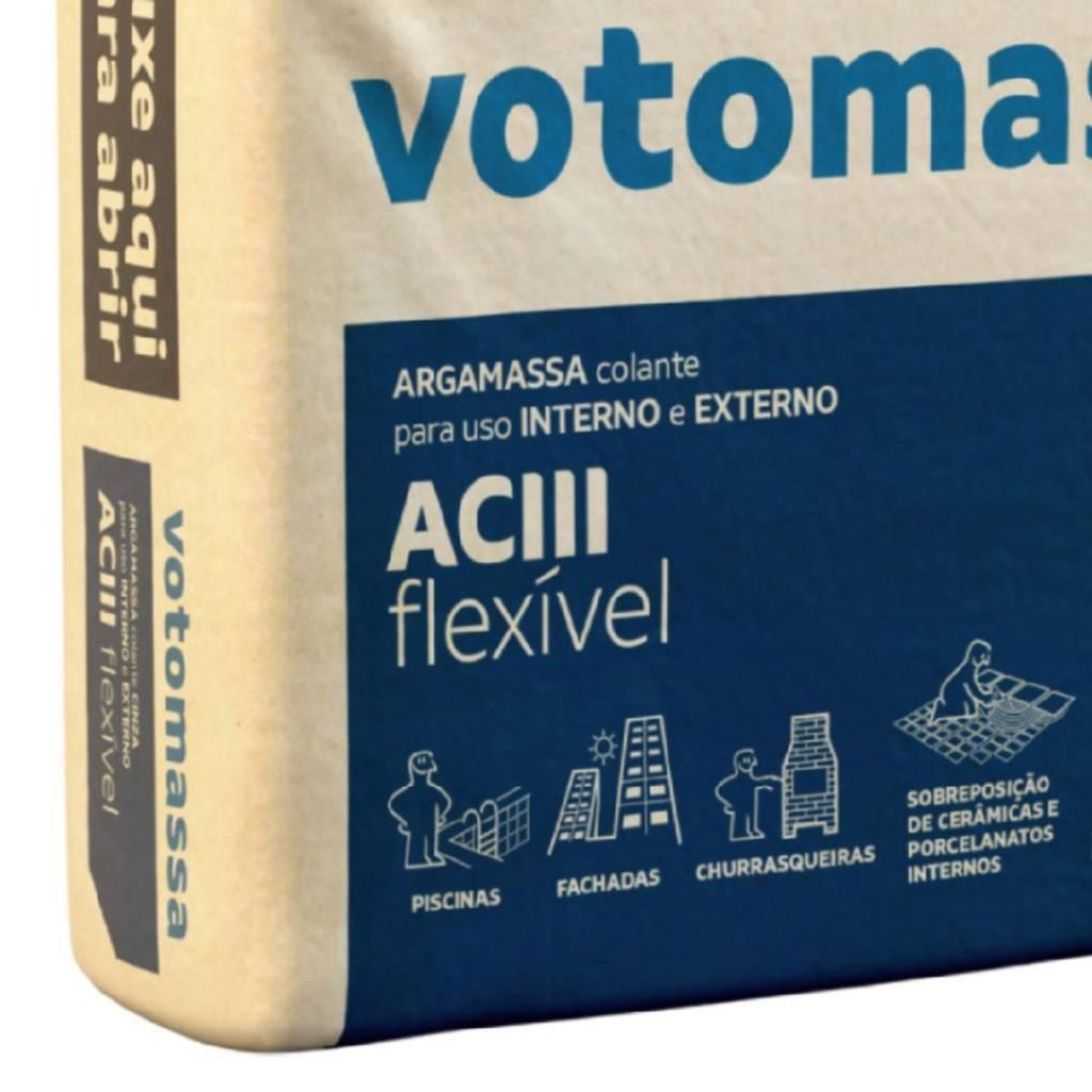 DESCRIÇÃO: Votomassa ACIII flexível cinza é uma argamassa que proporciona alta aderência e flexibilidade no assentamento de uma ampla variedade de revestimentos. CLASSIFICAÇÃO TÉCNICA: Votomassa ACIII flexível cinza atende os requisitos de classificação AC-III de acordo com a NBR 14081-1. COMPOSIÇÃO: Votomassa ACIII flexível cinza é composta de cimento Portland, agregados minerais selecionados e aditivos químicos. RECOMENDADO PARA: Assentamento de revestimentos cerâmicos, porcelanatos, pastilhas de porcelana e vidro, mármores e granitos em áreas internas e externas, pisos e paredes, piscinas (inclusas aquecidas), churrasqueiras e lareiras, fachadas e sobreposição de revestimento cerâmico e/ou porcelanato sobre revestimento cerâmico antigo em áreas internas ou externas. SUBSTRATOS RECOMENDADOS: A votomassa ACIII flexível cinza pode ser utilizada para assentamento de cerâmicas e porcelanatos diretamente nos seguintes substratos: • Argamassa de revestimento • Contrapiso • Gesso acartonado e bloco de gesso, indicado somente para aplicação em interiores, seguir sistema construtivo de acordo com NBR15758. • Marmorite, indicado somente para aplicação em interiores. • Piso de concreto • Parede de concreto confeccionados de acordo com NBR 16055, limitados a altura interna máxima de 5m. Em áreas externas seguir NBR13755, com dimensão de peça cerâmica até 30x30 cm ou 900 cm² e junta horizontais de movimentação espaçada no máximo a cada 3m ou a cada pé direito • Placas cimentícias • Alvenarias de bloco de concreto. • Revestimentos cerâmicos antigos, exceto lajotas cerâmicas do tipo: lajotas coloniais, lajotas terracotas, lajotas cerâmicas não esmaltadas, tijolos cerâmicos para revestimentos e similares.