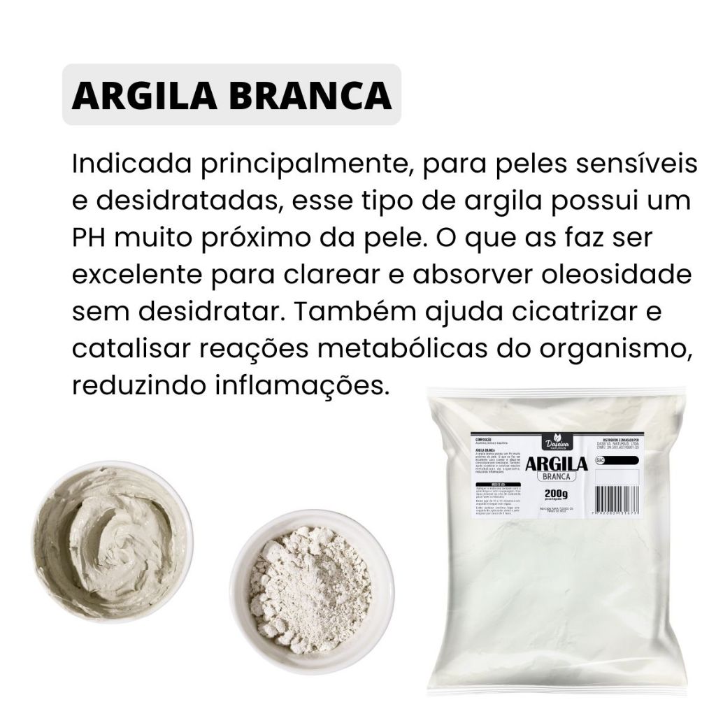 Empresa Daseiva Naturais, contém produtos naturais de alta qualidade, e tem o compromisso de construir uma relação de confiança com seu cliente. KIT CLAREADOR - ARGILA BRANCA + DOLOMITA CLAREADORA + ÓLEO DE ROSA MOSQUETA RUBIGINOSA Adquira já essa combinação eficaz para os cuidados com sua pele cheios propriedades. Produtos Naturais e essências para você. Com um pacote de argila branda de 200g/500g e um óleo de Rosa Mosqueta Rubiginosa de 30ml. MODO DE USO 1 colher de sopa de argila branca. 1 colher de sopa de Dolomita. Água filtrada ou Soro Fisiológico. 2-3 gotas de óleo de rosa mosqueta. PREPARO Misture a argila com água filtrada ou Soro Fisiológico até formar uma pasta. Adicione as gotas de óleo de rosa mosqueta e misture bem. APLICAÇÃO: Lave o rosto e seque. Aplique a máscara uniformemente, evitando olhos e lábios. Deixe agir por 15-20 minutos (não deixe secar completamente). REMOÇÃO Enxágue com água morna e seque o rosto. Aplique um hidratante. FREQUÊNCIA DE USO Use 1 a 2 vezes por semana. Nossa equipe está pronta para te auxiliar em todas as etapas da sua compra, desde a escolha do produto ideal até o pós-venda. Conte conosco para tirar dúvidas, resolver problemas e garantir sua total satisfação.