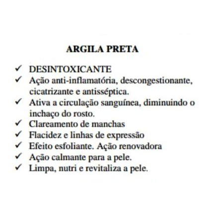 Kit contendo 5 pacotes de argila, com 100g cada. Total de 500g. 100g argila Esfoliante 100g argila Preta 100g argila Verde 100g argila Rosa 100g argila Cinza Total de 500g. Modo de usar: PASSO 1: Lave o rosto com um sabonete específico para a sua pele; PASSO 2: Aproveite o vapor da água quente para deixar os poros abertos; PASSO 3: Enxugue o rosto com uma toalha de algodão, sem esfregar; PASSO 4: Aplique a máscara em todo o rosto, exceto ao redor dos olhos e da boca, com uma espátula ou pincel limpos; PASSO 5: Espere alguns minutinhos e remova com água a temperatura ambiente e pronto! Pele iluminada, hidratada e renovada!