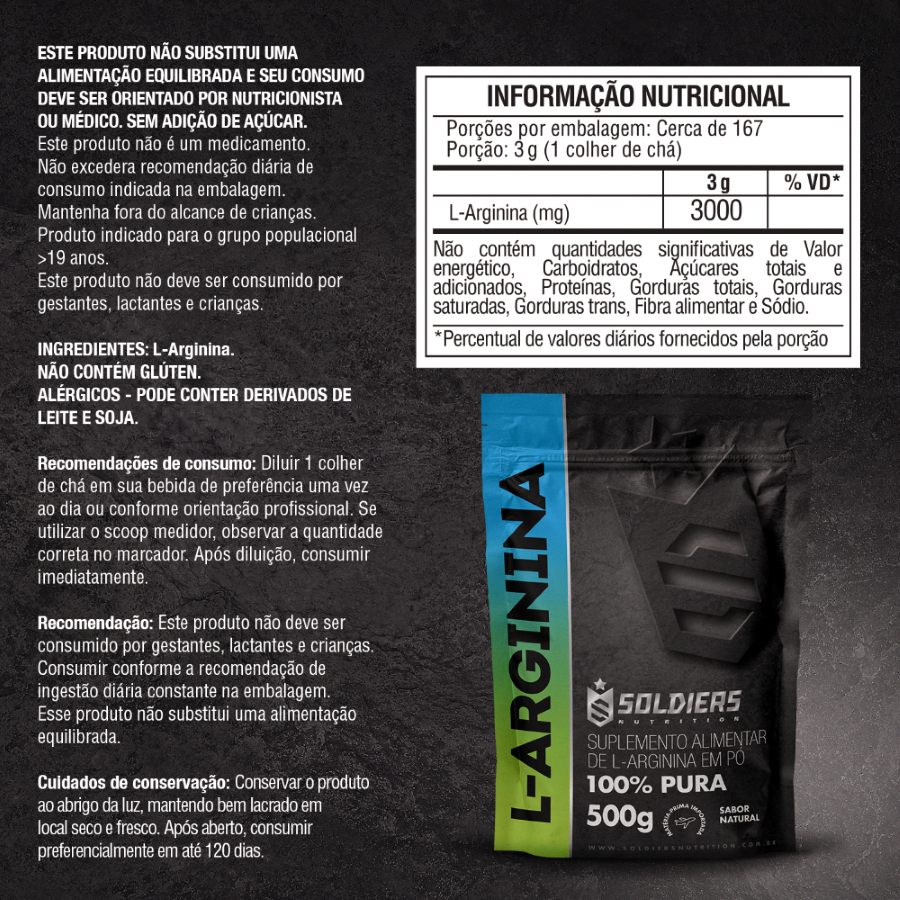 Arginina 500g 100% Puro Importado Soldiers Nutrition Aminoácido Suplemento Nutricional Recuperação Muscular