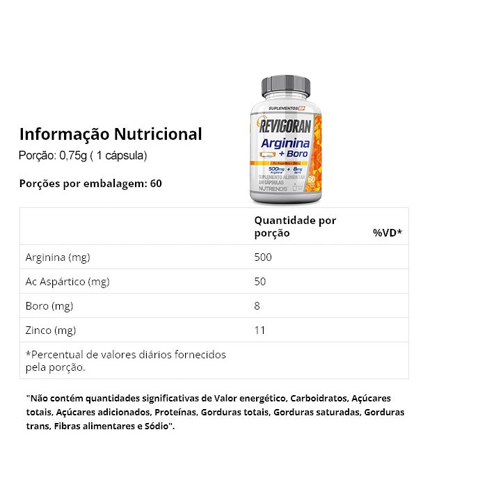 Arginina + Boro Ácido Aspártico Zinco 60 caps Revigoran