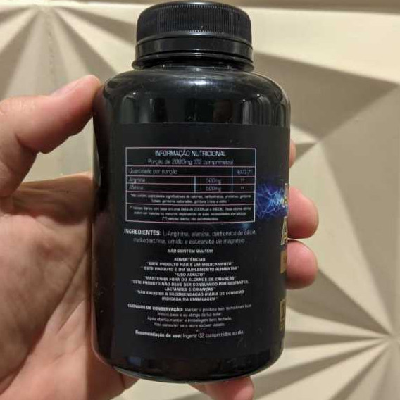 DESCRIÇÃO DO PRODUTO : Nome: Arginina + Alanina Premium 120 comprimidos 1000mg ============================================ RECOMENDAÇÃO DE USO: Ingerir 2 Comprimidos ao dia. ============================================ COMPOSIÇÃO: L-Arginina, Alanina, Carbonato de cálcio, Maltodextrina, amido e estearato de magnésio. ============================================ A arginina é um aminoácido importante para várias funções do organismo, como melhora da cicatrização, aumento da atividade do sistema imune e eliminação de toxinas do corpo, além de também ajudar a melhorar o desempenho muscular ao aumentar o ganho de massa magra e diminuir a fadiga. O consumo diário de arginina melhora o desempenho físico por reduzir a fadiga muscular, reduz a fadiga por estar associada à vasodilatação promovida pelo óxido nítrico que é formado a partir da L-arginina. Consumo de arginina resulta em vasodilatação, por sua vez esta condição resulta em aumento da oferta de nutrientes ao tecido muscular e maior oferta de glicose pelos músculos durante atividade física. A Alanina é um suplemento que tem ganhado cada vez mais destaque entre os atletas, especialmente porque sua função principal pode ser aproveitada para uma série de modalidades, não só para os treinos na academia. É uma das principais opções para esportistas de treinamentos aeróbicos intensos, como natação, ciclismo e atletismo. A máxima performance é garantida com os produtos certos, usando também para práticas anaeróbicas intensas. Ela é um importante aminoácido e vale a pena conhecer mais sobre sua ação no corpo. BENEFÍCIOS: - Melhora na secreção de gH. - Melhora a vasodilatação. - Melhora a perfusão muscular. - Reduz o aparecimento da fadiga precoce. - Aumento de massa muscular. - Aumento de força. ADVERTÊNCIAS: Crianças, gestantes, idosos e portadores de qualquer enfermidade devem consultar o médico e/ou nutricionista. Este produto não substitui uma alimentação equilibrada e seu consumo deve ser orientado por um nutricionista e/ou médico. Conservar este produto bem fechado, em lugar fresco e seco, protegido dos raios solares. Depois de aberto, consumir preferencialmente em até 30 dias. "ANVISA: Registro ISENTO conforme resolução RDC ANVISA 23/00 E 27/10 anexo I.'' =============================================