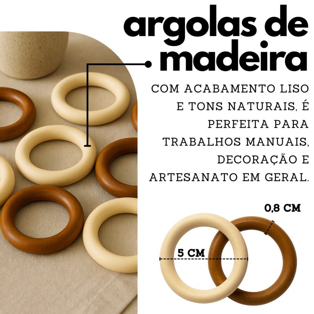 Argolas de Madeira: Adicione charme, versatilidade e um toque natural aos seus projetos! Com acabamento refinado e disponível em cores modernas, ela é perfeita para mesa posta, artesanato, macramê e diversas aplicações decorativas. Um item prático e elegante para composições criativas. SOBRE O PRODUTO: • Material: Madeira • Cores disponíveis: Creme (Marfim) ou Marrom (Cerejeira) • Diâmetro: 5 cm • Espessura: 0,7 cm • Acabamento: Liso, resistente e com leve brilho • Observação: Pode haver pequenas variações na tonalidade da peça QUALIDADES E APLICAÇÕES: • MULTIUSO: Ideal para artesanato, macramê, lembrancinhas e brindes personalizados • DECORAÇÃO VERSÁTIL: Pode ser usada em cortinas, varões, mesas postas e projetos DIY • DESIGN NATURAL: Tons modernos que combinam com diferentes estilos de decoração • ACABAMENTO PREMIUM: Envernizada, com leve brilho e toque suave Prática, bonita e resistente, a argola de madeira é o detalhe perfeito para dar um toque especial às suas criações! > Pode haver pequenas variações na tonalidade da peça