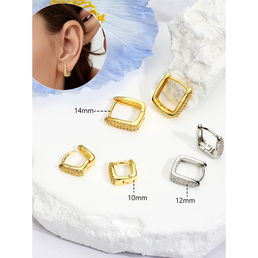 Argola Delicado Elegante Antialérgico Folheado Ouro 18k a Platina Quadrada 3 Fileira Zircônia Cravejada