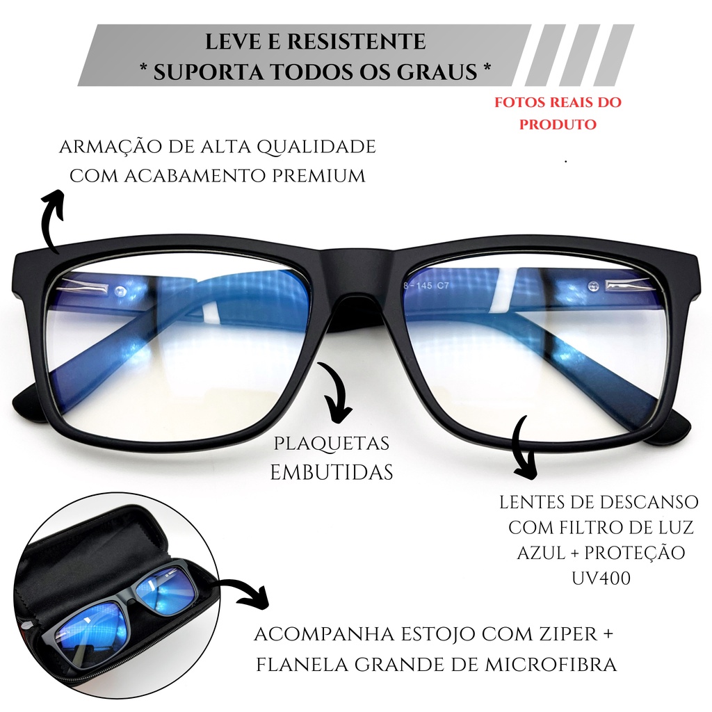 Armação Masculina Óculos Quadrado Grau Resistente Ou Lupa Descanso Tr90 Filtro Luz Azul