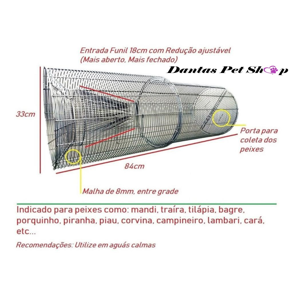 A DANTAS PETSHOP E A SHOPEE BRASIL !!! 01 – COVO – ARMADILHA COVO PARA PEIXES - Cod. G99 ---DESCRIÇÃO--- - A Dantas Petshop traz mais uma novidade para você cliente o “Covo” Armadilha para capturar Peixes São 2 partes, uma dentro da outra chegando a 84 cm quando esticadas; - A entrada tem 18 cm e vai afunilando até aproximadamente 10 cm que é onde o peixe vai entrar mas não vai conseguir sair, esta entrada é ajustável, devendo abrir mais para peixes maiores e fechar para peixes menores, a parte de traz do covo tem uma porta de acesso com mola de pressão para remoção dos peixes; - Utilize em águas calmas como açudes, rios, lagoas; - Para peixes tipo: mandi, traíra, tilápia, bagre, porquinho, piranha, piau, corvina, campineiro, cará, lambari, etc... Resposta a um Cliente... - Não temos relatos de utilização em águas salgadas, mas tivemos clientes que compraram com esta finalidade - Produto vai montado e embalado em caixa apropriada ---Características--- - O Covo para Peixe é feito em aramado galvanizado com tratamento e zincagem prata; - Porta de acesso com acionamento por mola / pressão, dentro para fora; - Gancho para transporte; - Malha de 8 mm. Medidas: Comprimento aberto: 84 cm Diâmetro: 33 cm Comprimento fechado: 45 cm Malha: 8 mm - A compra é segura com Nota Fiscal do produto, caso tenha algum problema tanto com a entrega quanto com o produto, A Shopee garante o reembolso do pagamento efetuado. Visite nossa loja Dantas Petshop aqui você encontra os melhores produtos para seu Pet. APROVEITE E COMPRE AGORA, PRODUTO A PRONTA ENTREGA COM ENVIO RÁPIDO. - Qualquer dúvida entre em contato pelo Chat, teremos o maior prazer responde-las. Boas compras!