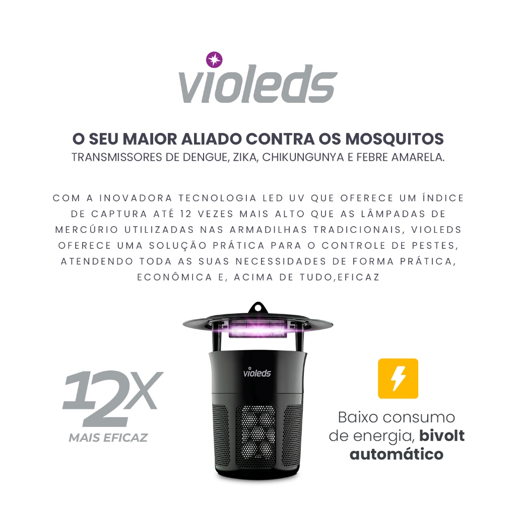 *Rede de Compras* Armadilha Mata Mosquitos e Pernilongos Luz UV Violeds Bivolt para Ambientes Internos e Externos – MQHN12 Conteúdo da Embalagem 01 Armadilha mata mosquitos 01 Manual de instruções Descrição do Produto A armadilha perfeita contra mosquitos transmissores de dengue, zika, chikungunya e febre amarela. Enquanto repelentes e armadilhas tradicionais apenas espantam os mosquitos temporariamente, Violeds atrai, captura e mata. Utiliza a tecnologia LED UV, que elimina os insetos com 12 vezes mais eficácia do que armadilhas comuns. Sem uso de produtos químicos, sem resíduos e sem necessidade de refil, atuando em uma área de até 50m². Características Baixo consumo de energia Fonte de luz LED UV ecológica Sem recarga ou reposição de lâmpadas Sem necessidade de produtos químicos, gases, inseticidas ou recargas Desempenho pelo menos 12 vezes superior ao das armadilhas tradicionais Operação silenciosa, sem emissão de ruídos Fácil de limpar, manusear e transportar Não causa alergia Informações Técnicas Marca: VIOLEDS Cor: Preto Conteúdo da embalagem: Produto / Manual / Fonte Alimentação: Fonte 12V Tamanho do cabo: 244 cm Voltagem: 110/220V Peso do produto: 0,359 kg Peso bruto: 0,891 kg Dimensões do produto (A x L x P): 23 cm x 20 cm x 20 cm Dimensões da embalagem (A x L x P): 27 cm x 20,5 cm x 20,5 cm Classificação fiscal NCM: 8543.70.99 Código do produto (SKU): MQ-HN Certificação INMETRO: 652.101.605.003 Como Violeds Funciona? Posicione o aparelho no ambiente desejado e ligue-o na tomada. Para melhores resultados, use em ambientes escuros e a 1,5m do chão. Dicas para Maior Eficiência Posicione acima de 1,5 metros Utilize em ambientes escuros Mantenha ligado por 24h, principalmente à noite Evite outras fontes de luz próximas Perguntas Frequentes (FAQ) Ela é à prova d'água? Não. A placa de LED UV e o sistema de exaustão não podem ter contato com água. Com que frequência devo deixar ligada? Devido ao baixo consumo de energia, o uso ininterrupto é permitido. Qual é a área de alcance? Até 50m². Informações Importantes Garantia contra defeitos de fabricação Todos os produtos enviados em até 24h