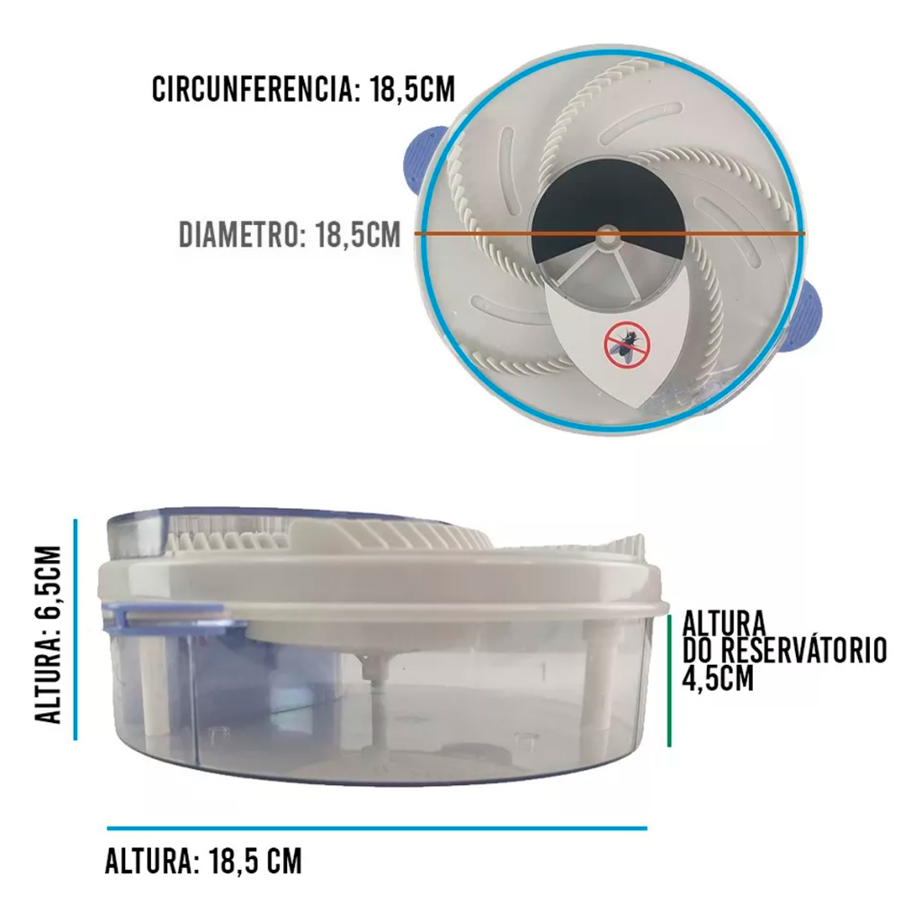 COMERCIAL VIPASA DISTRIBUIDORA Este produto e a solução que você estava procurando para acabar com as Moscas e Mosquitos, seja na sua casa, no seu estabelecimento e em qualquer outro lugar! Com esta armadilha de moscas você precisa apenas colocar uma isca para prender os insetos , como mel, um pouco de sobra de comida que caiba na armadilha. Ligue o aparelho e deixe o mesmo funcionando no tempo que desejar, ele possui um baixo consumo de energia, e as moscas vão sendo capturadas e ficando presas no reservatório. Depois você pode liberar-las onde desejar. ATENÇÃO: Para que o produto funcione e é necessário colocar no aparelho algum alimento para atrair as moscas. ATENÇÃO: Este aparelho não MATA MOSCAS apenas captura as mesmas. ATENÇÃO: Este produto não acompanha adaptador para energia CARACTERÍSTICAS: Núcleos: Branco e Azul Material: Polipropileno Baixo consumo de energia Potência do motor: 4w Botão ON e OFF Sem Som Silencioso Reservatório para os Insetos Capacidade do reservatório: 1 Litro (1kg) Alimentação: Bivolt ATENÇÃO: Para que o produto funcione é necessário colocar no aparelho algum alimento para atrair as moscas. ATENÇÃO: Este aparelho não MATA MOSCAS apenas captura as mesmas. ATENÇÃO: Este produto não acompanha adaptador para energia DIMENSOES APROXIMADAS: Altura Total: 6,5 cm Largura Total: 18,5 cm Diâmetro Total: 18,5 cm Circunferência total: 57cm Altura reservatório: 4,5 cm Largura reservatório: 18,5 cm Comprimento reservado: 12,5 cm Comprimento do Cabo: 80cm ATENÇÃO: Para que o produto funcione e seja necessário colocar algum alimento no aparelho para puxar as moscas. ATENÇÃO: Este produto não acompanha adaptador para energia ARMADILHA PEGA MOSCAS COMERCIAL VIPASA DISTRIBUIDORA