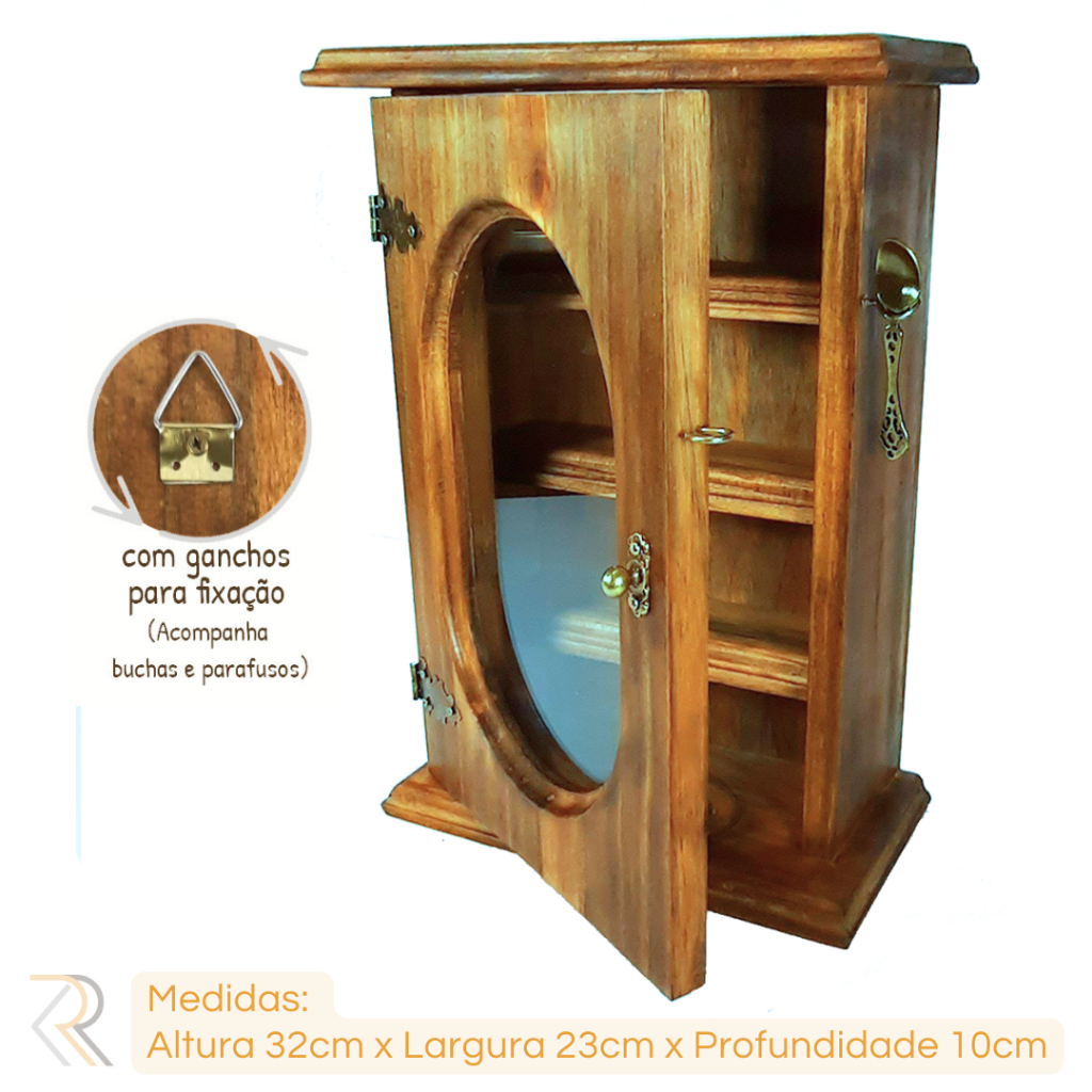 Belíssimo Armário em estilo Colonial, com ferragens em cor ouro velho, muito requinte, delicadeza e durabilidade para a peça! PRODUTO NÃO ACOMPANHA OS POTINHOS - ARMARINHO VAZIO Produto confeccionado com Madeira Maciça 100% reciclada, com 4 prateleiras, portinha de madeira com dobradiças e puxador em metal, fechamento com uma delicada colherzinha substituindo um trinco para a porta (veja detalhes nas fotos). Produto lindo podendo ser fixado tanto na parede (tem dois ganchos tipo triangulo que ficam invisíveis na parte traseira) como pode ser usado na bancada. Material: Madeira tratada de Pinus – Nossos produtos são pintados e/ou envernizados e encerados dando acabamento e proteção à madeira, oferecendo aos nossos clientes um produto final de ótima qualidade. TAMANHO aproximado do Porta tempero: ALTURA 32cm x LARGURA 23cm x PROFUNDIDADE 10cm Cor: Rústico Produto acompanha ganchos para fixação bem como kit de parafusos e buchas. ATENÇÃO: Potinhos de Vidro não acompanham o produto. Armarinho vai Vazio. Nossos produtos são feitos um a um manualmente com muito cuidado e zelo na produção. Cada produto é único e pode conter diferenças sutis quanto à foto, tanto no tamanho como na pintura, além das imperfeições naturais da madeira. Nós da R&R Madeiras nos importamos com o meio ambiente e utilizamos madeiras 100% recicladas e/ou de reflorestamento, pensando assim em unir o bonito ao sustentável. Mande suas dúvidas no campo de perguntas e/ou nos encontre nas principais mídias sociais.