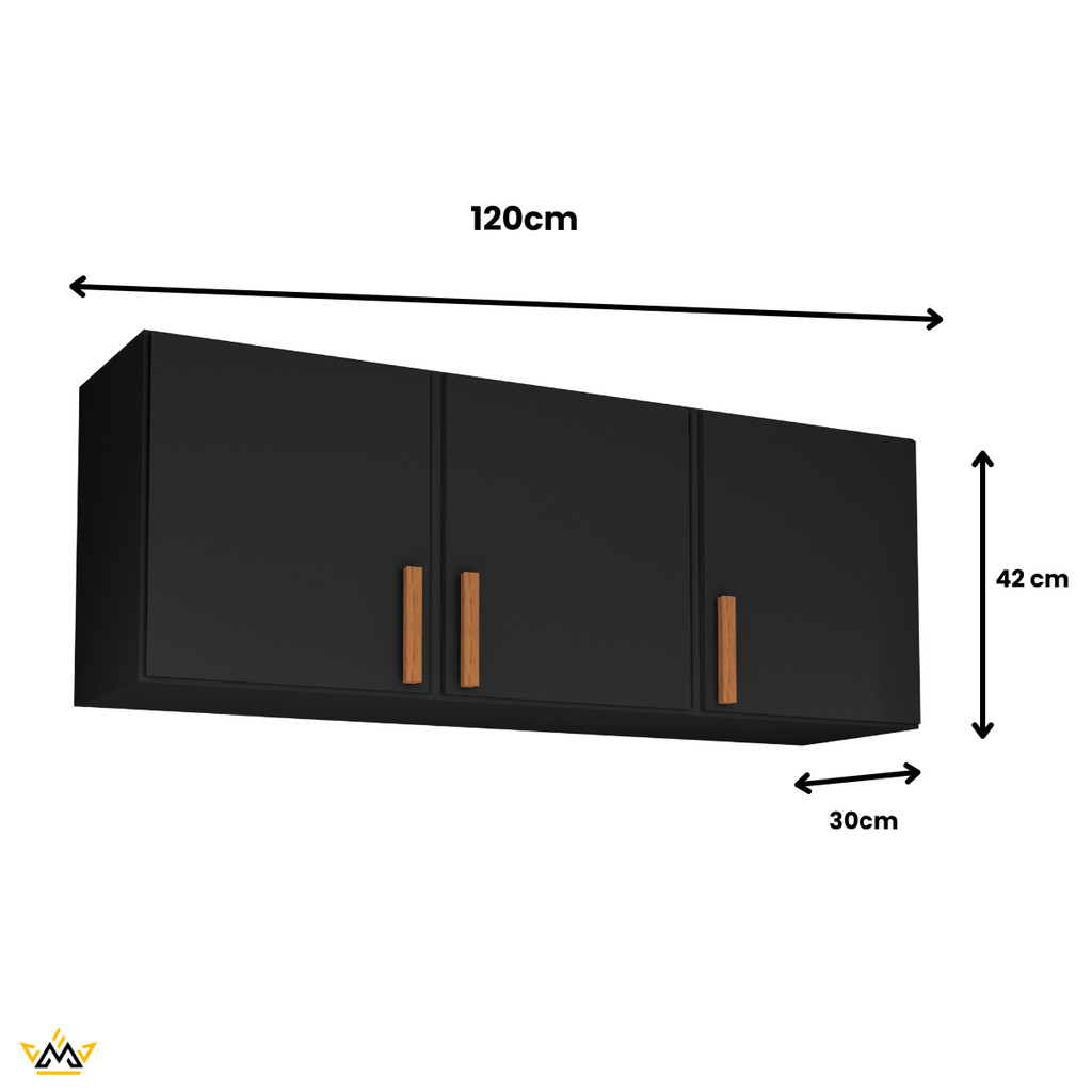 O Armário Medusa 120 entrega design clean, ótimo aproveitamento de espaço e acabamento moderno para compor cozinha, lavanderia, home office ou área gourmet. As 3 portas deixam tudo organizado e protegido do pó, enquanto os puxadores amadeirados dão o toque de estilo que combina com qualquer decoração. Por que escolher o Medusa? Visual elegante e atual: frente lisa e puxadores em tom amadeirado que valorizam o ambiente. Organização inteligente: três compartimentos fechados para manter utensílios e mantimentos sempre à mão. Formato versátil: ideal para cozinhas compactas ou para ampliar a armazenagem acima da bancada. Combina com tudo: vai bem com estilos modernos, industriais e minimalistas. Medidas (aprox.) Largura: 120 cm Altura: 42 cm Profundidade: 30 cm Dica: meça sua parede antes de instalar para garantir encaixe perfeito. Características técnicas Modelo: Armário Aéreo Medusa 120 Configuração: 3 portas (dobradiças metálicas comuns) Acabamento: preto fosco com puxadores em tom amadeirado Instalação: fixado na parede (utilize buchas e parafusos adequados ao seu tipo de parede; recomenda-se instalação por profissional) Onde usar Cozinha: pratos, copos, mantimentos e utilidades do dia a dia Lavanderia: produtos de limpeza e organizadores Home office/Quarto: livros, pastas e miudezas sem poluição visual Conteúdo da embalagem 1 Armário Aéreo Medusa 120 (3 portas) (objetos decorativos não acompanham; imagens meramente ilustrativas) Cuidados e manutenção Limpe com pano macio, levemente umedecido e detergente neutro. Evite produtos abrasivos e contato prolongado com umidade.