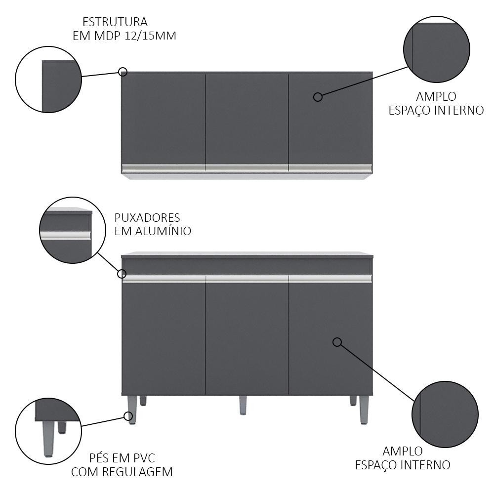 Armário Aéreo Andréia e Balcão Gabinete Para Pia Com Tampo Manu 120cm Cinza - AJL Móveis