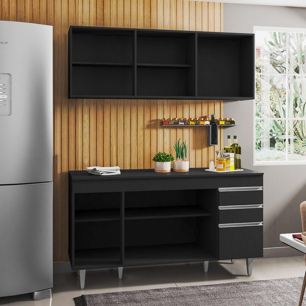 Armário Aéreo Argélia e Balcão Gabinete Para Pia 150cm com Tampo Marrocos Preto - Lumil Móveis