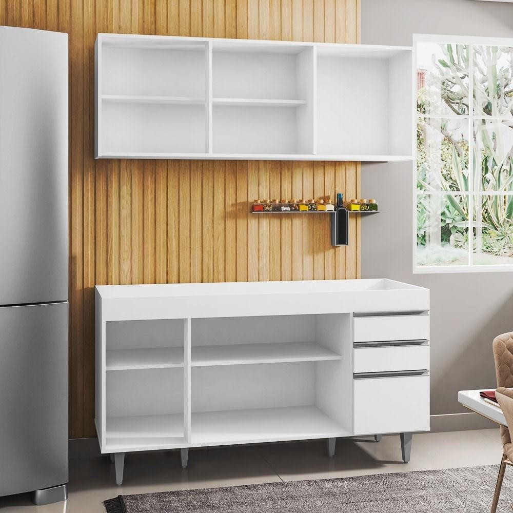 Armário Aéreo Argélia e Balcão Gabinete Para Pia 150cm sem Tampo Marrocos Branco - Lumil Móveis