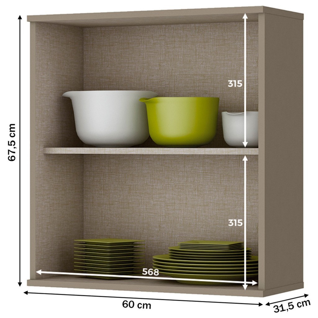 Dimensões: - Altura: 67,50 cm - Largura: 60,00 cm - Profundidade: 31,50 cm - Peso: 15,000 kg Descrição: O(a) Armário Aéreo Cozinha évelin 1 Porta Duna/Cristal - Henn é produzido em MDF na escala de brilho Fosco, e possui um grau de dificuldade de montagem: Médio. Seu revestimento/acabamento é: Pintura UV. Infelizmente a Loja não oferece serviço de montagem, deixamos essa informação bem clara em todas as nossas páginas de produto. Onde especificamos que os móveis chegarão desmontados, e que a montagem fica por conta do cliente. Como não oferecemos esse serviço não embutimos o mesmo no preço dos produtos, ou seja, maior economia para você! Todos os nossos móveis também acompanham o manual de montagem, e caso você queira, pode realizar a montagem você mesmo, sempre especificamos os graus de montagem dos produtos. Nos casos de grau baixo e médio, com pouco ou nenhum conhecimento, você mesmo pode efetuar a montagem, e fazer essa economia. Apenas nos graus de montagem alto, recomendamos a contratação de um montador com experiência, visto que são montagens mais complicadas. A montagem é feita com Parafusos, cavilhas e Minifix.. Este móvel é indicado para que seja utilizado no(a) Cozinha, dando um toque especial no cômodo de sua casa. Para que você mantenha seu produto sempre em ótimo estado, recomendamos que use apenas um pano seco ou levemente umedecido, sem o uso de quaisquer produtos abrasivos. A Loja garante aos clientes, 90 dias de garantia nos produtos, porém, recomendamos que entre em contato com o fornecedor/marca do produto, pois o mesmo(a), pode garantir um prazo maior de garantia. Lembrando ainda que: quaisquer objetos decorativos que aparecem nas imagens, não acompanham o produto. Características: - Espessura da Estrutura: 15 mm - Possui Gavetas?: Não - Possui Portas?: Sim - Quantidade de Portas: 1 - Material da Porta: MDF - Espessura da Porta: 15 mm - Tipo de Porta: Portas de Bater - Material das Dobradiças: Metálica - Possui Vidro?: Não - Possui Espelho?: Não - Possui Prateleiras?: Sim - Quantidade de Prateleiras: 1 - Peso Suportado nas Prateleiras:: 8 Kg - Possui Puxadores?: Sim - Material do Puxador: Alumínio - Possui Ripamento?: Não - Linha ou Coleção: Évelin - Montagem Invertida?: Não Pode ser Montado Invertido - É frágil?: Sim - Possui Nicho?: Não - Material da Estrutura: MDF - Escala de Brilho: Fosco - Material do Tampo: MDF - Espessura do Tampo (mm): 15 - Possui Rodízios?: Não - Possui Sapatas?: Não - Possui Pés?: Não - Pés com regulagem de altura?: Não - Cozinha Suspensa: Sim - Tipo de Móveis de Cozinha: Armário Balcão - Possui Espelho: Não - Possui Vidro: Não - Tamanho Unico Grande Pequeno: Único - Acompanha: 1 Armário aéreo e 1 manual de montagem - Acompanha Manual de Montagem: Sim - Como os Móveis Chegarão na Minha Casa: Desmontado em caixas, acompanhado de todas as peças, ferragens e manuais para montagem. - Grau de Dificuldade da Montagem: Médio - Necessita de Montagem: Sim - Sistema de Montagem: Parafusos, cavilhas e Minifix. - Garantia (dias): 90 - Indicação de Uso: Cozinha - Observação: Objetos decorativos que aparecem nas imagens, não acompanham o produto. - Recomendação de Manutenção: Utilizar pano levemente umedecido, seguido de pano seco. Não utilizar quaisquer produtos abrasivos. - Revestimento /Acabamento: Pintura UV