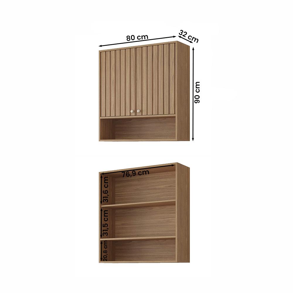 Modelo: Armário Aéreo Divina 80 cm; Material da estrutura: Tampos e Laterais em MDF 15mm; Prateleira e portas em MDF 12mm com ripado em MDF em 6mm; Altura: 90 cm; Largura: 80 cm; Profundidade: 32 cm; Quantidade de portas: 02; Tipo de dobradiças: Metálicas com sistema soft close; Quantidade de gavetas: Não se aplica; Tipo de corrediças: Não se aplica; Com puxador: sim, plástico; Quantidade prateleiras: 04; Quantidade de nicho: 02; Peso suportado: até 10 kg distribuídos. Requer montagem: Sim (kit montagem incluso); Embalagem do envio: Papelão e plástico; Informações adicionais: - Os objetos que ambientam as fotos não acompanham o produto; - O produto será entregue desmontado; - É de inteira responsabilidade do cliente a montagem do produto e/ou instalação, custos de transporte por escadas e/ou elevadores, guincho ou içamento, assim como possíveis irregularidades provenientes de manuseio inadequado; - Embora o produto acompanhe o manual de montagem, verifique a complexidade antes de decidir montá-lo sozinho, recomendamos que contrate um profissional de sua confiança; - Fique atento, nossas cores podem sofrer alterações dependendo do seu monitor; - ANTES DE MONTAR O SEU PRODUTO, certifique-se que todas as instruções dispostas no manual, bem como todas as ferragens descritas, estejam presentes dentro da embalagem. Verifique se há alguma peça danificada, caso esteja, prestaremos a devida assistência dentro do prazo da garantia.