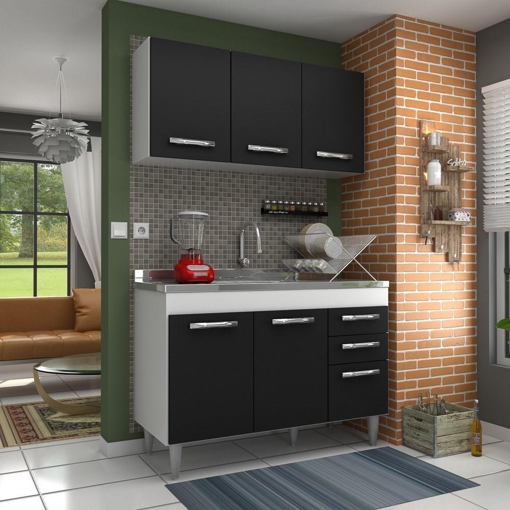 Armário Aéreo Honduras e Balcão Gabinete Suécia com Pia Inox 120cm Branco/Preto - Lumil Móveis