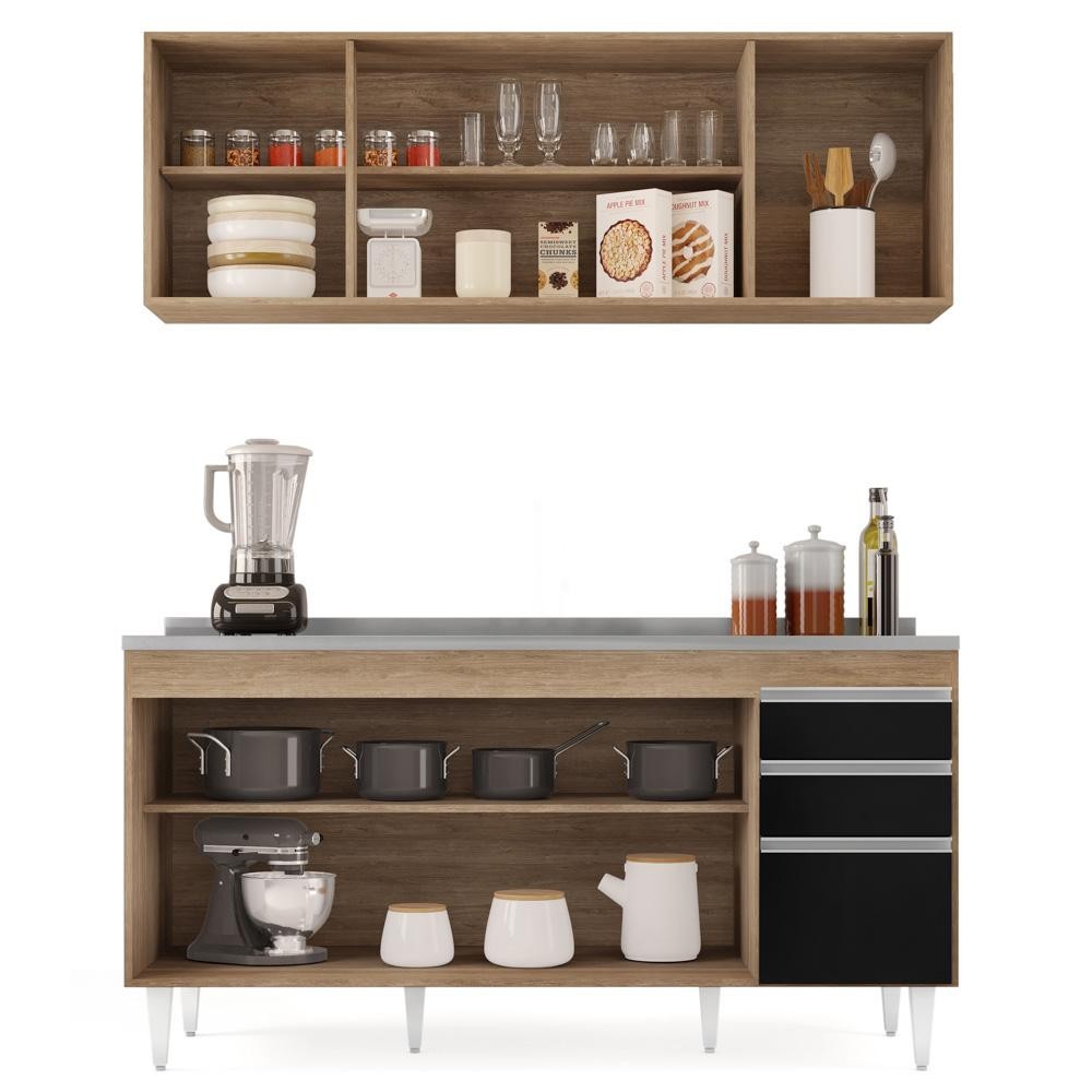 Pensando em renovar os móveis da casa? Conheça o Armário Aéreo Nevada e Balcão Gabinete com Pia 160cm Arkansas Castanho/Preto, da Lumil e encante-se! Com tantos modelos diferentes de móveis para cozinha, qual escolher? Essa é uma dúvida frequente quando vamos escolher os móveis para compor os ambientes da casa. Por isso, apresentamos os móveis que vão completar a sua cozinha e deixá-la funcional, linda e com um toque de sofisticação. O Armário Nevada conta com 4 portas e 1 prateleira, com amplo espaço interno é uma ótima opção para guardar seus utensílios, copos, pratos e potes, suporta até 40 kg distribuídos. Já o Balcão Arkansas possui 4 portas, 2 gavetas com corrediças metálicas, 1 prateleira e pés reguláveis que facilitam a posição do móvel, com uma excelente divisão interna, foi projetado para guardar talheres, panelas, eletrodomésticos e tudo o que você precisar. Ambos contam com puxadores em alumínio agregando beleza ao ambiente e são produzidos em MDP revestidos em Melamina BP e acabamento com fita de borda em papel, garantindo qualidade, resistência e durabilidade! Ainda acompanha um Pia Inox com cuba central, escorredor duplo e forro concretado que facilita o preparo das refeições e o escoamento de água, facilitando o seu dia a dia. Incrível né? Então não perca essa chance, adicione ao seu carrinho! ESPECIFICAÇÕES Dimensões do Produto (L x A x P) Armário: 160 cm x 54 cm x 28,5 cm. Balcão: 157 cm x 83 cm x 50 cm. Pia Inox: 160 cm x 13,5 cm x 53 cm. Peso: 95 kg. **A ACOMPANHA PIA INOX / COM FURAÇÃO DE USO OPCIONAL PARA TORNEIRA. Características do Produto Material da Estrutura: MDP 15 mm. Material do Fundo: MDF 3 mm. Peso Suportado: Balcão: 40 Kg distribuídos/ Armário: 40 Kg distribuídos. Acompanha Pia: Sim. Material da Pia: Inox. Acompanha Válvula: Sim. Diâmetro da Válvula: 3.1/2. Acabamento: Melamina BP. Escala de Brilho: Fosco. Quantidade de Portas: 8 Portas. Material da Porta: MDP. Tipo de Porta: Convencional. Quantidade de Gavetas: 2 Gavetas. Material da Gaveta: MDP. Tipo de Puxador: Alumínio. Tipo de Corrediças: Metálicas. Possui Prateleiras: Sim. Quantidade de Prateleiras: 2. Material da Prateleira: MDP. Possui Pés: Sim. Quantidade de Pés: 6. Tipo de Pés: PVC com regulagem. Diferenciais: - Design moderno. - Pés ajustáveis entre 17 cm a 18,5 cm. - Pia Inox com espelho traseiro concretado. Sistema de Montagem: Cavilhas/Parafusos. Manual de Montagem: Sim. Complexidade da Montagem: Média. Volumes: 3 Volumes. Conteúdo da Embalagem: 1 Armário aéreo, 1 Balcão, 1 Pia. Garantia do Fabricante: 90 dias contra defeito de fabricação. Montagem: Recomendamos que seja feita por um profissional. Recomendação de Limpeza: Utilize pano úmido. Observações importantes: - Produto para uso residencial em ambiente interno, não devendo ficar exposto diretamente ao sol, calor e umidades excessivas. - Pode haver alguma diferença de tonalidade entre a imagem e o produto real, por conta do tratamento de imagens e a calibração de cores do seu monitor. - As imagens são meramente ilustrativas, não acompanham objetos de decoração e eletrônicos. - Confira o estado da embalagem, não devendo assinar o comprovante em caso de danos. - Não asseguramos, no ato da entrega, por subir escadas/elevadores, pelo transporte por guincho em apartamentos ou montagem, desmontagem e instalações. Eventuais despesas são por conta do comprador. - Confira as dimensões do produto e certifique-se de que passará normalmente por supostos elevadores, portas, escadas e/ou corredores de sua residência.