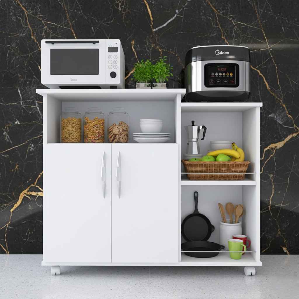FRUTEIRA ARMÁRIO BALCÃO P/ BEBEDOURO E MICROONDAS Permitido apenas 3x unidades por compra Para você que procura um móvel que ocupa pouco espaço e que ofereça beleza e praticidade desenvolveu esse lindo armário, ideal para te ajudar na organização da sua cozinha, dispensa, lavanderia, com 02 portas, 01 Nicho para utensílios domésticos e tem 02 espaços suficientes para armazenarem frutas, legumes etc, além de rodinhas para facilitar sua locomoção na hora da limpeza do dia a dia. [Medidas] - ALTURA: 72cm - LARGURA: 88,7cm - PROFUNDIDADE: 30,7cm [Descrição do produto] - 2 Portas - 2 Espaços para Frutas - Cor: Branco C/ Tampo Preto ou Todo Branco - Rodízios - Rodinhas Brancas - Material: Madeira Mdp - Puxadores PVC Cromado - Comporta Micro-ondas e Bebedouro Ótima bancada para Bebedouro, Máquina de Café.. Pode ser usado na Cozinha, Lavanderia, Escritório, diversas partes da casa