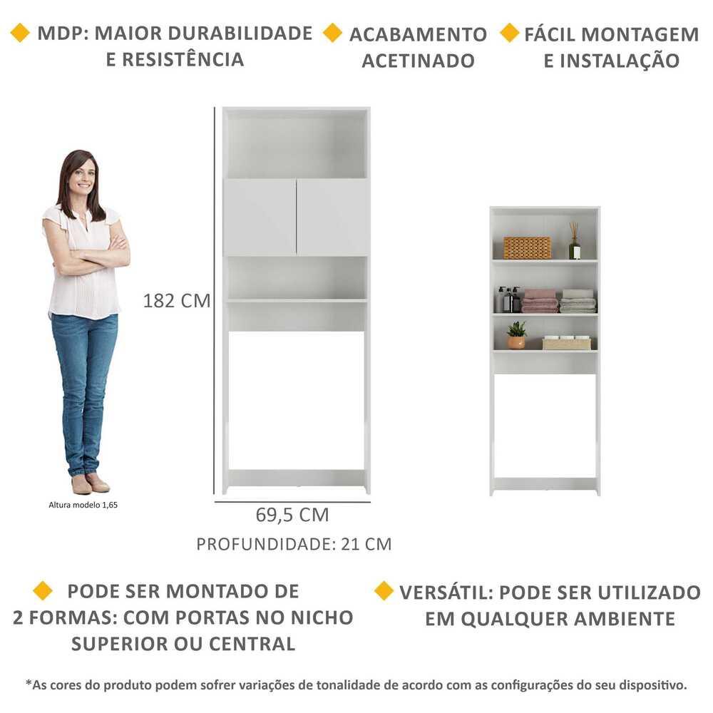 O Armário Banheiro para Vaso Sanitário 2 Portas Nina Multimóveis é produzido em MDP, que garante maior durabilidade e resistência, possui acabamento acetinado (cerca de 20% de brilho) e é ideal para espaços compactos. Com 2 portas e prateleiras, possui espaço para você organizar seus produtos de higiene pessoal, toalhas e demais itens. Desenvolvido especificamente para se adaptar aos vasos sanitários com caixa acoplada e aproveitar um espaço que até então era inutilizado, ainda pode ser montado de duas formas: com as portas no nicho superior ou central. Para maior segurança, sugerimos que o móvel seja obrigatoriamente fixado na parede. Conteúdo da Embalagem: 1 (um) armário 2 portas Dimensões do produto montado: Altura: 182cm | Largura: 69,5cm | Profundidade: 21cm *Você pode consultar as medidas internas na imagem técnica do produto. *As cores do produto podem sofrer variações de tonalidade de acordo com as configurações do seu dispositivo. Imagem meramente ilustrativa. Decoração não acompanha o produto. O produto será entregue desmontado e não disponibilizamos o serviço de montagem.