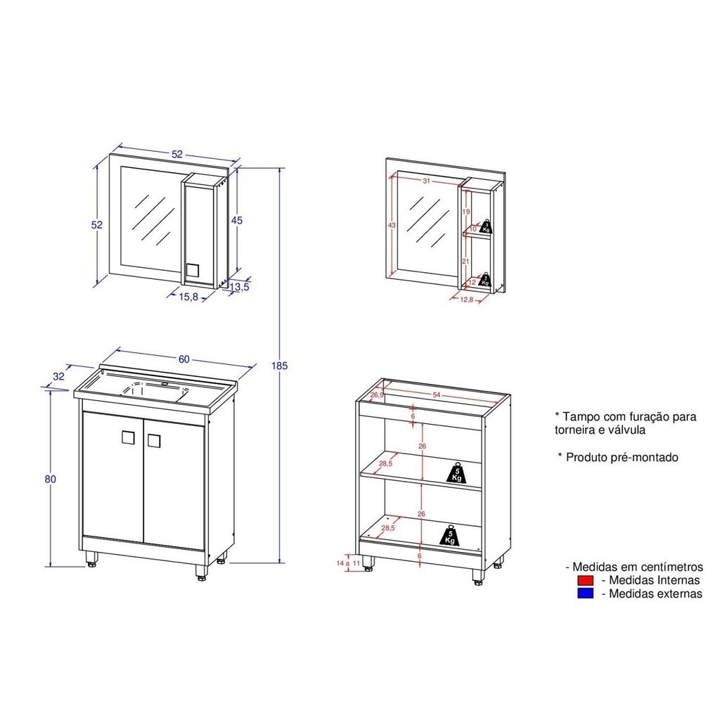 Armário Conjunto de Banheiro com Gabinete, Cuba e Espelheira 3 Portas 60 cm